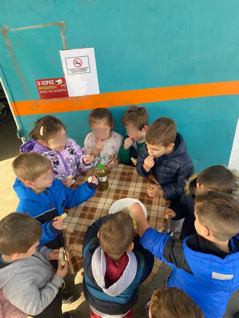 Αφού, ήρθαν σε επαφή με όλα τα μηχανήματα στο ελαιουργείο, ο υπεύθυνος τους κέρασε ψωμί με λάδι και τα παιδιά για να ευχαριστήσουν για την φιλοξενία τους πρόσφεραν γλυκίσματα!