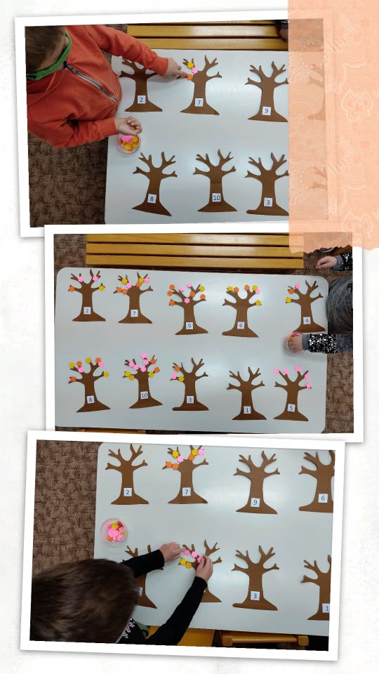 Για να εξασκηθούμε με τους αριθμούς μετρήσαμε ανθάκια!Πως το κάναμε αυτό;Παίξαμε ένα παιχνίδι φυσικά.Είχαμε δέκα κορμούς δέντρων που πάνω τους έγραφαν από έναν αριθμό και εμείς αφού βρίσκαμε ποιός αριθμός ήταν πάνω στο δέντρο έπρεπε να βάλουμε πάνω στα κλαδιά του τόσα άνθη.Για δείτε: