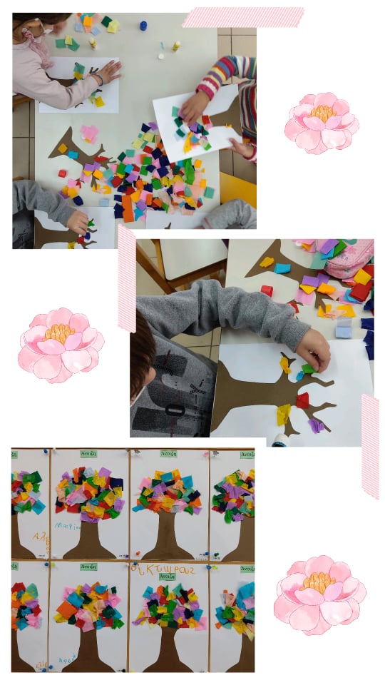 Στη συνέχεια επειδή πολύ μας άρεσε η ομαδική μας δημιουργία του ανοιξιάτικου δέντρου φτιάξαμε και ατομικά δέντρα με πολύχρωμα χαρτάκια γκοφρέ.