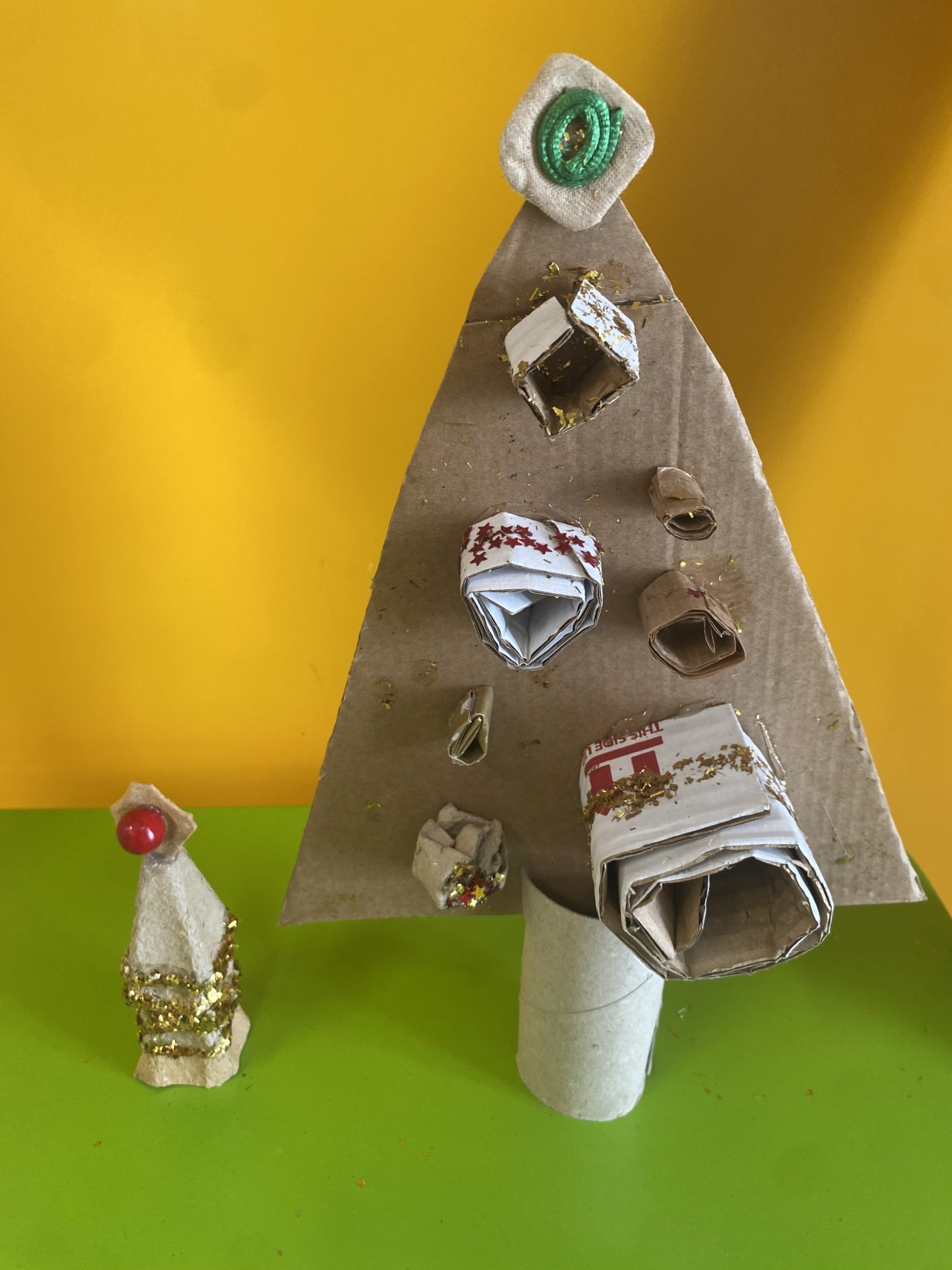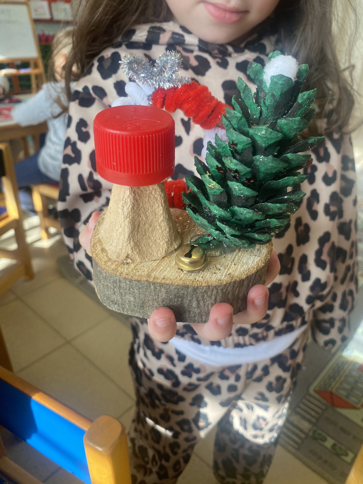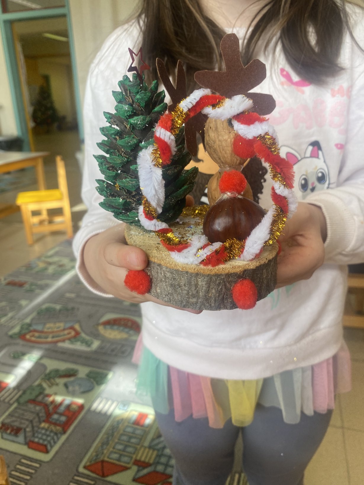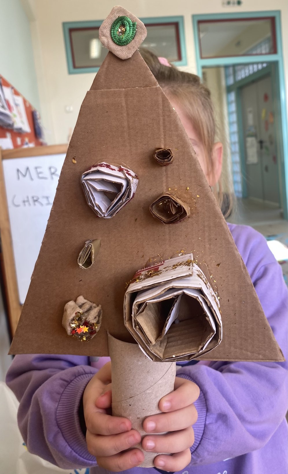 ,δίνοντας ιδιαίτερη σημασία στην επαναχρησιμοποίηση χαρτιού για την προστασία των δασών.Τα παιδιά κατασκεύασαν έλατα με χάρτινες αβγοθήκες και χαρτόκουτες,αλλά και κάρτες με έλατα με χαρτί από περιοδικά και χαρτόκουτα.Με τα στολίδια τους στόλισαν το χώρο του Νηπιαγωγείου ενώ στις κάρτες έγραψαν ευχές για καλές γιορτές.Νωρίτερα όμως