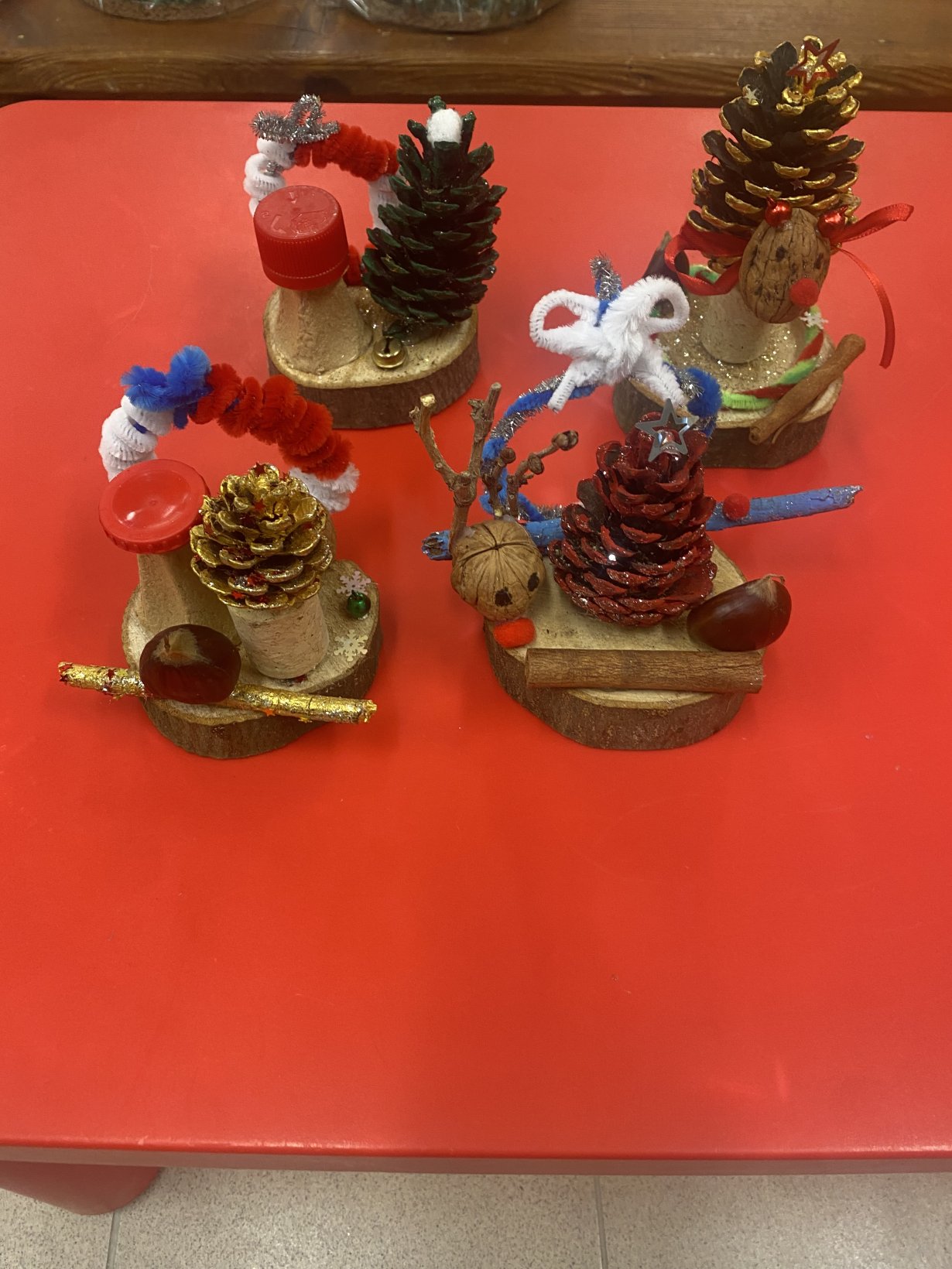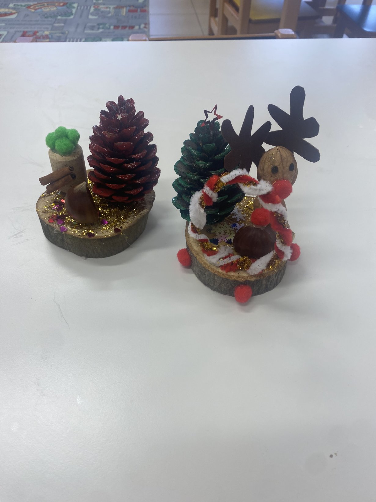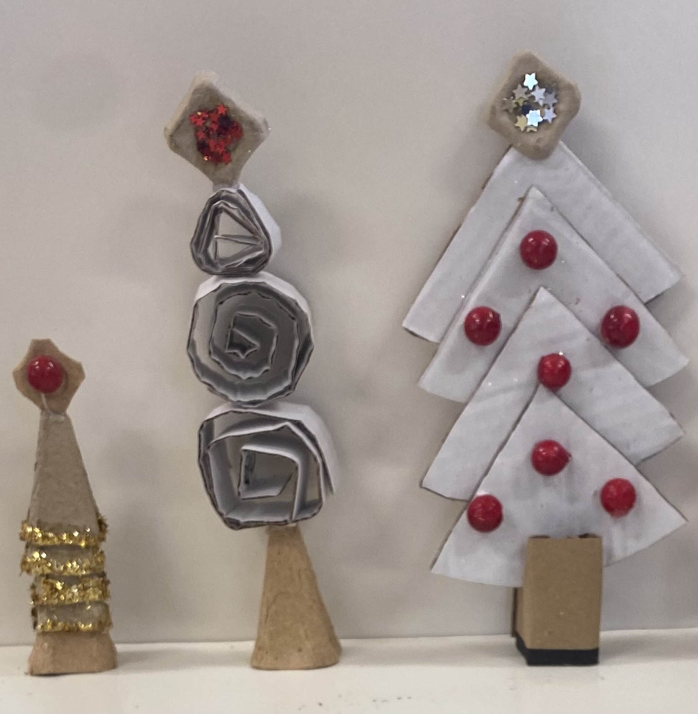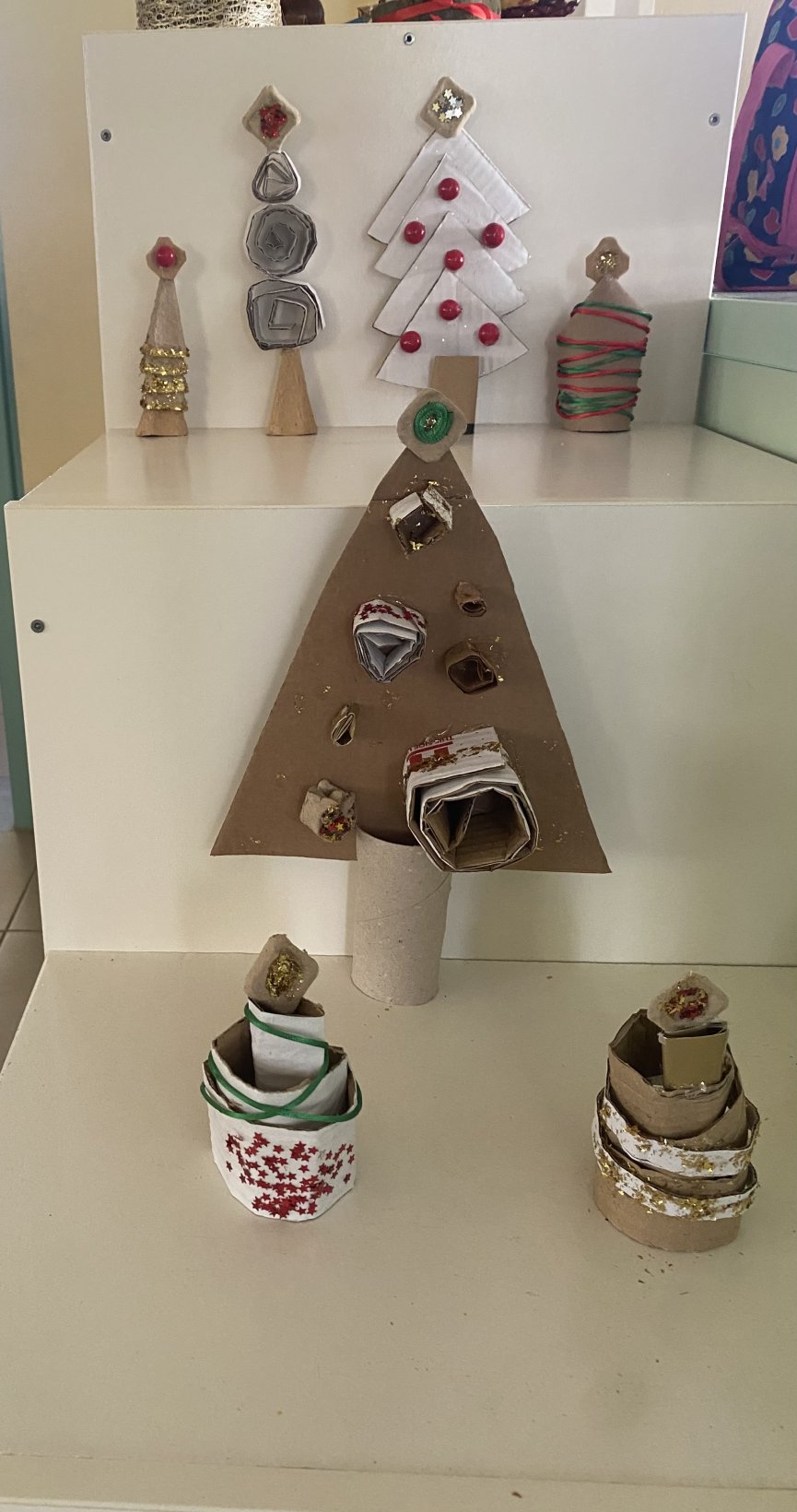 ,δίνοντας ιδιαίτερη σημασία στην επαναχρησιμοποίηση χαρτιού για την προστασία των δασών.Τα παιδιά κατασκεύασαν έλατα με χάρτινες αβγοθήκες και χαρτόκουτες,αλλά και κάρτες με έλατα με χαρτί από περιοδικά και χαρτόκουτα.Με τα στολίδια τους στόλισαν το χώρο του Νηπιαγωγείου ενώ στις κάρτες έγραψαν ευχές για καλές γιορτές.Νωρίτερα όμως