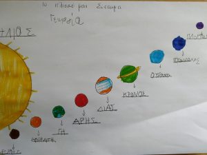 Σε φύλλο εργασίας αντέγραψαν τα ονόματα των πλανητών και ζωγράφισαν.