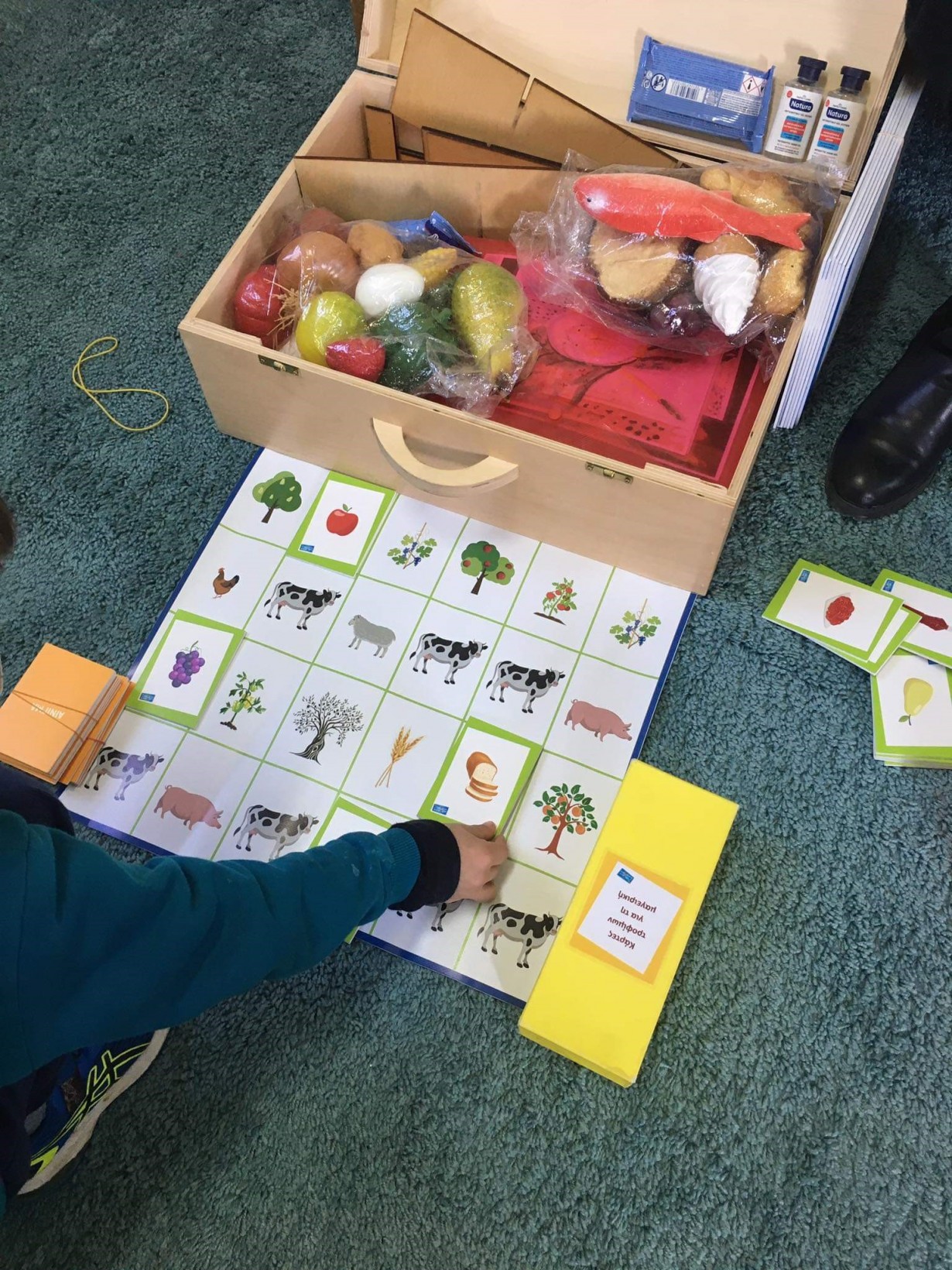 Κάρτες με τρόφιμα ζωικής και φυτικής προέλευσης, ομοιώματα τροφίμων, ξύλινες κουτάλες με μαγνήτη, συνταγές, διατροφική πυραμίδα σε μουσαμά, παροιμίες, αινίγματα, γλωσσοδέτες, πλαστικοποιημένες εικόνες με πίνακες ζωγραφικής κ.α
