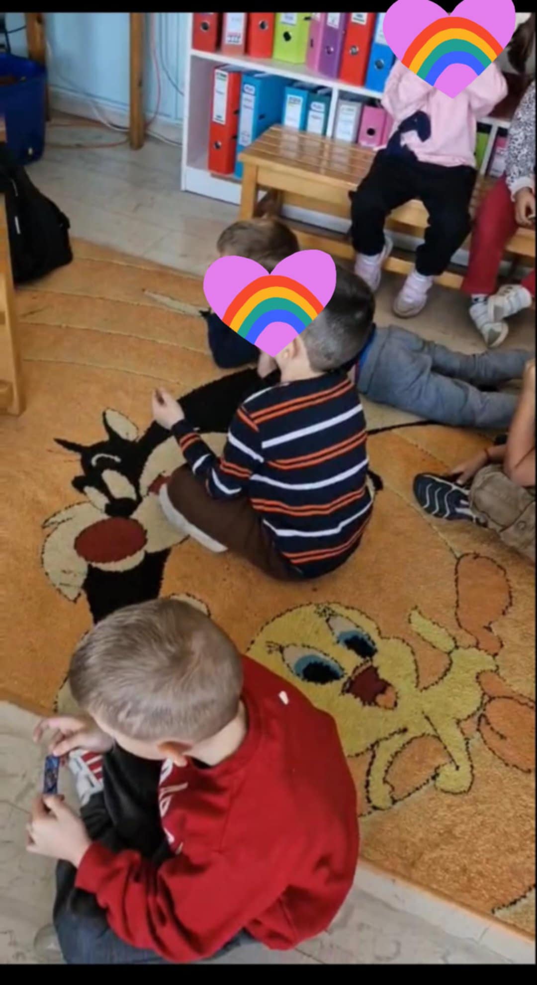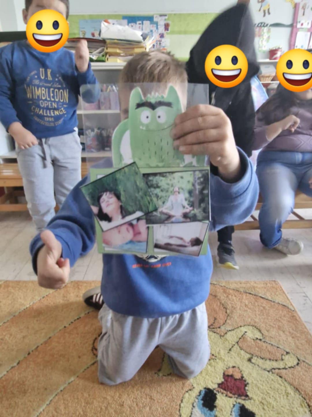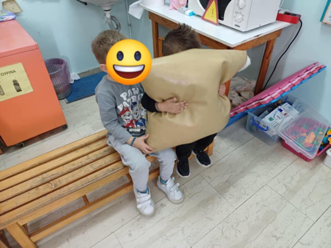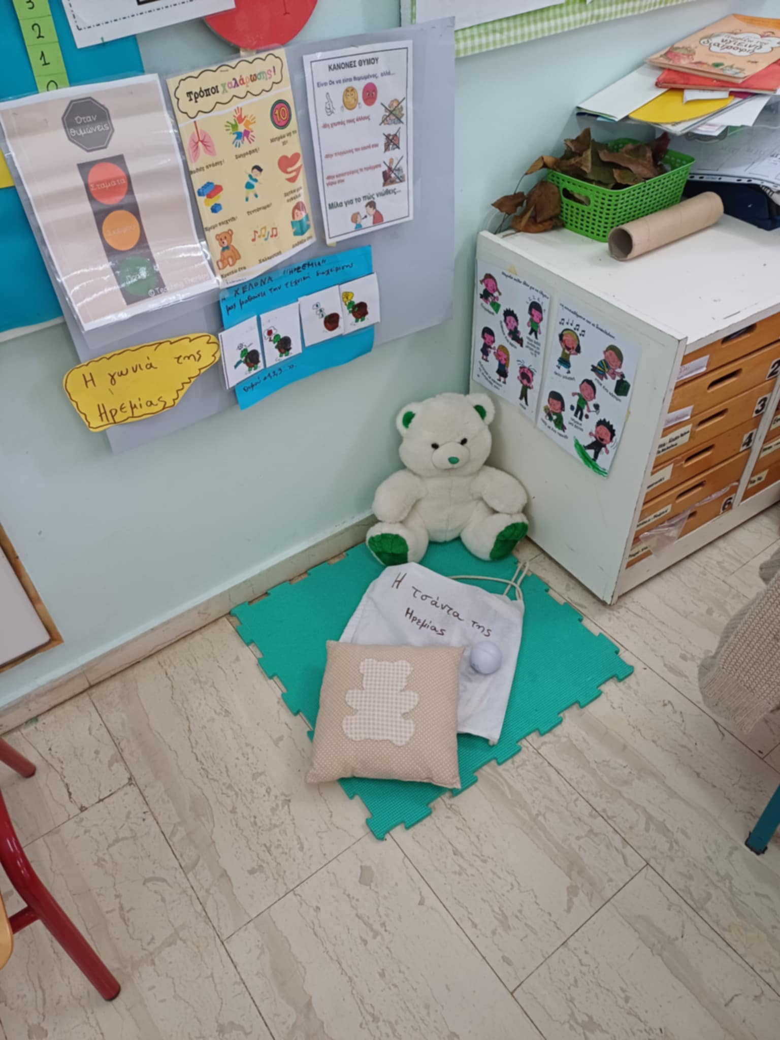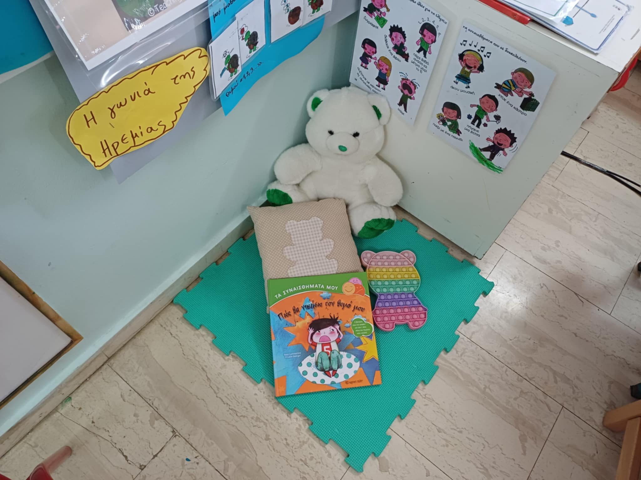Έτσι συζητήσαμε με ποιους τρόπους μπορούμε να ηρεμούμε όταν κι εμείς νιώθουμε θυμό και φτιάξαμε και εμείς στο νηπιαγωγείο μας τη ”γωνιά της Ηρεμίας” όπου μπορούμε να πηγαίνουμε όταν νιώθουμε θυμό για να ηρεμούμε με το υλικό που υπάρχει εκεί (μαξιλάρι, μπαλάκι anti-stress, αρκουδάκια, pop-it) και όταν ηρεμούμε να επιστρέφουμε ξανά στο παιχνίδι με τους φίλους μας.
