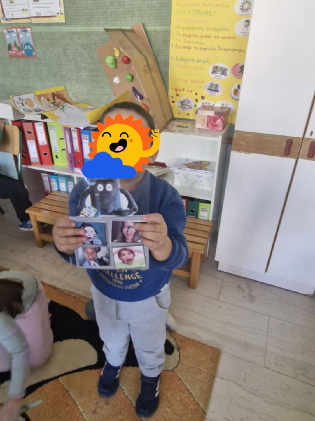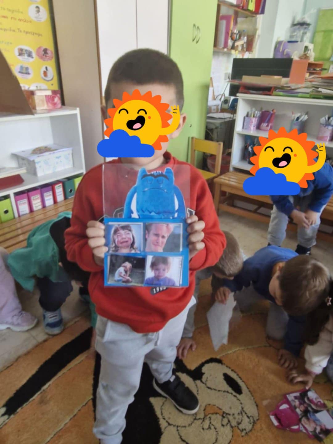 Επειδή τα συναισθήματά μας είναι πολύ σημαντικά και πολλές φορές σε αυτά οφείλεται η συμπεριφορά μας ασχοληθήκαμε στο νηπιαγωγείο μας με τα συναισθήματα και μάθαμε να τα αναγνωρίζουμε αλλά και να τα διαχειριζόμαστε με σκοπό να συμπεριφερόμαστε με τρόπο κοινωνικά αποδεκτό, ακόμα και όταν βιώνουμε άσχημα συναισθήματα, πχ θυμό.