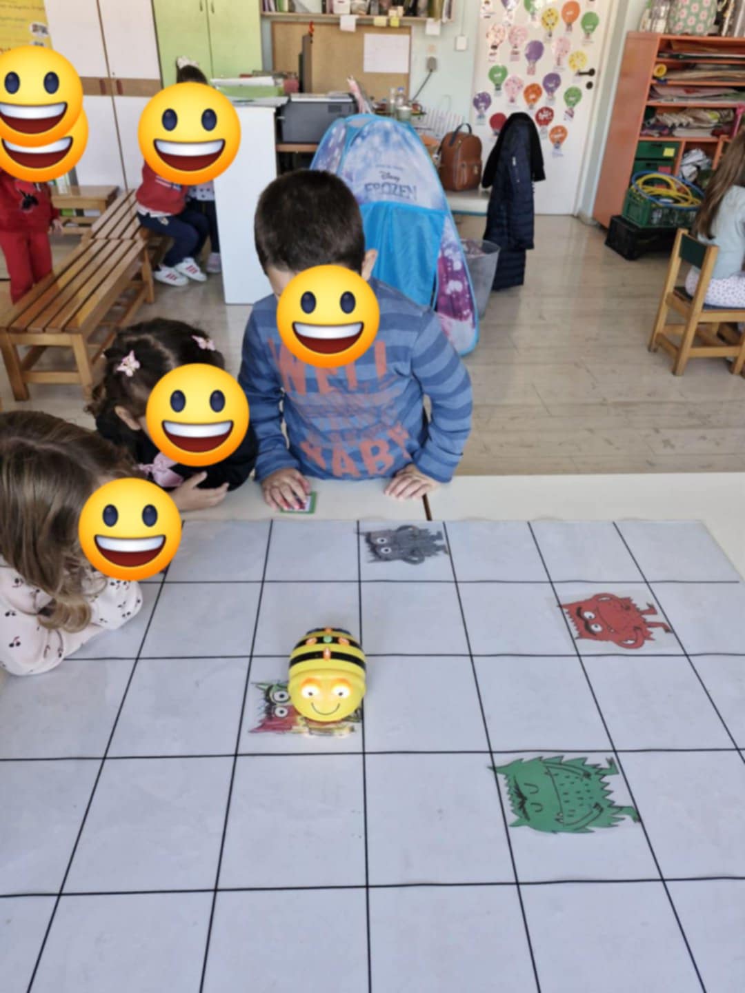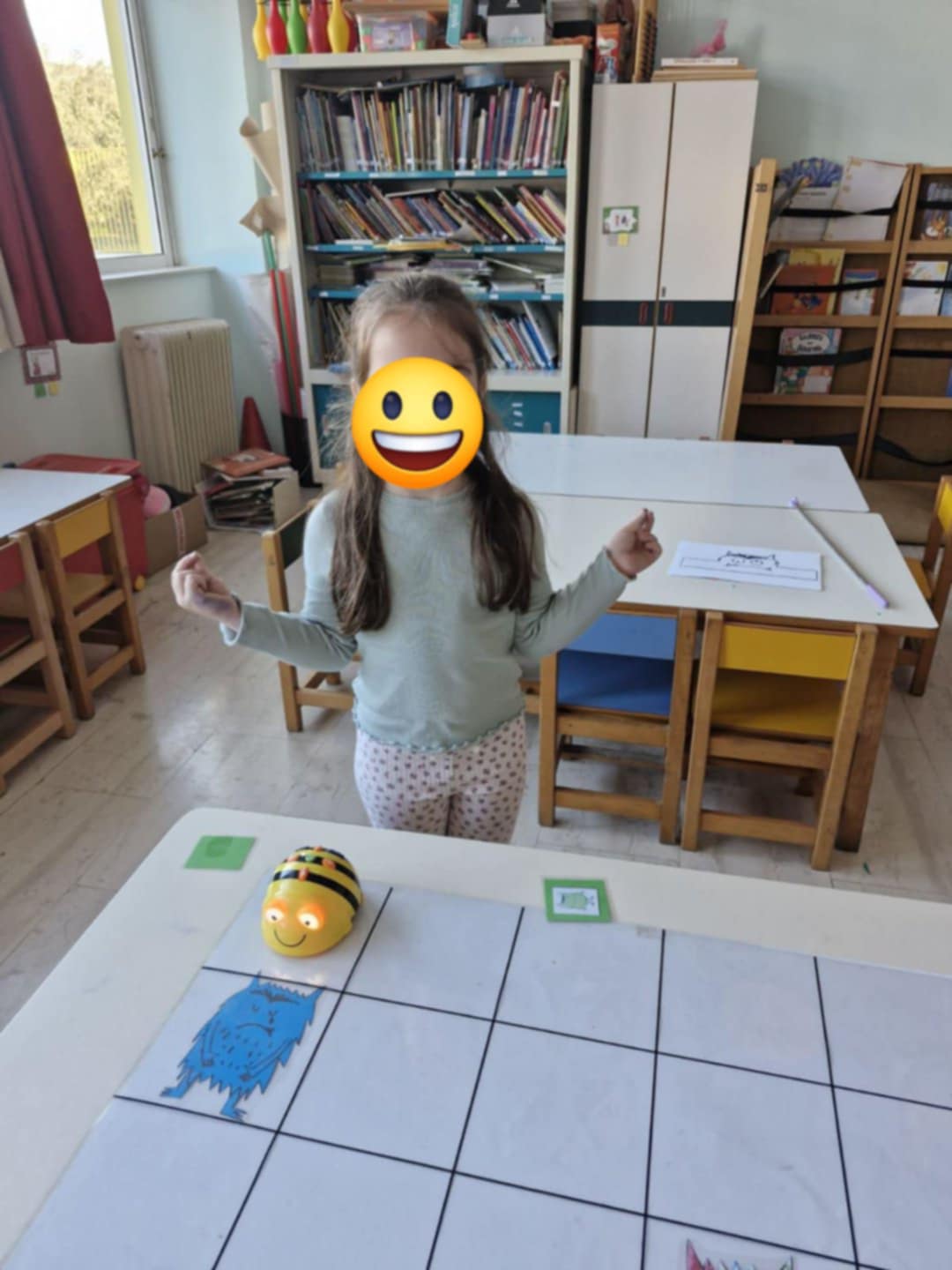 Παίξαμε και με τη μελισσούλα bee-bot: τραβούσαμε κάρτα και στη συνέχεια ανάλογα με το ποιο εικονιζόμενο τερατάκι-συναίσθημα μας τύχαινε τα παιδιά προγραμμάτιζαν τη bee-bot να φτάσει στο αντίστοιχο τερατάκι στην πίστα.