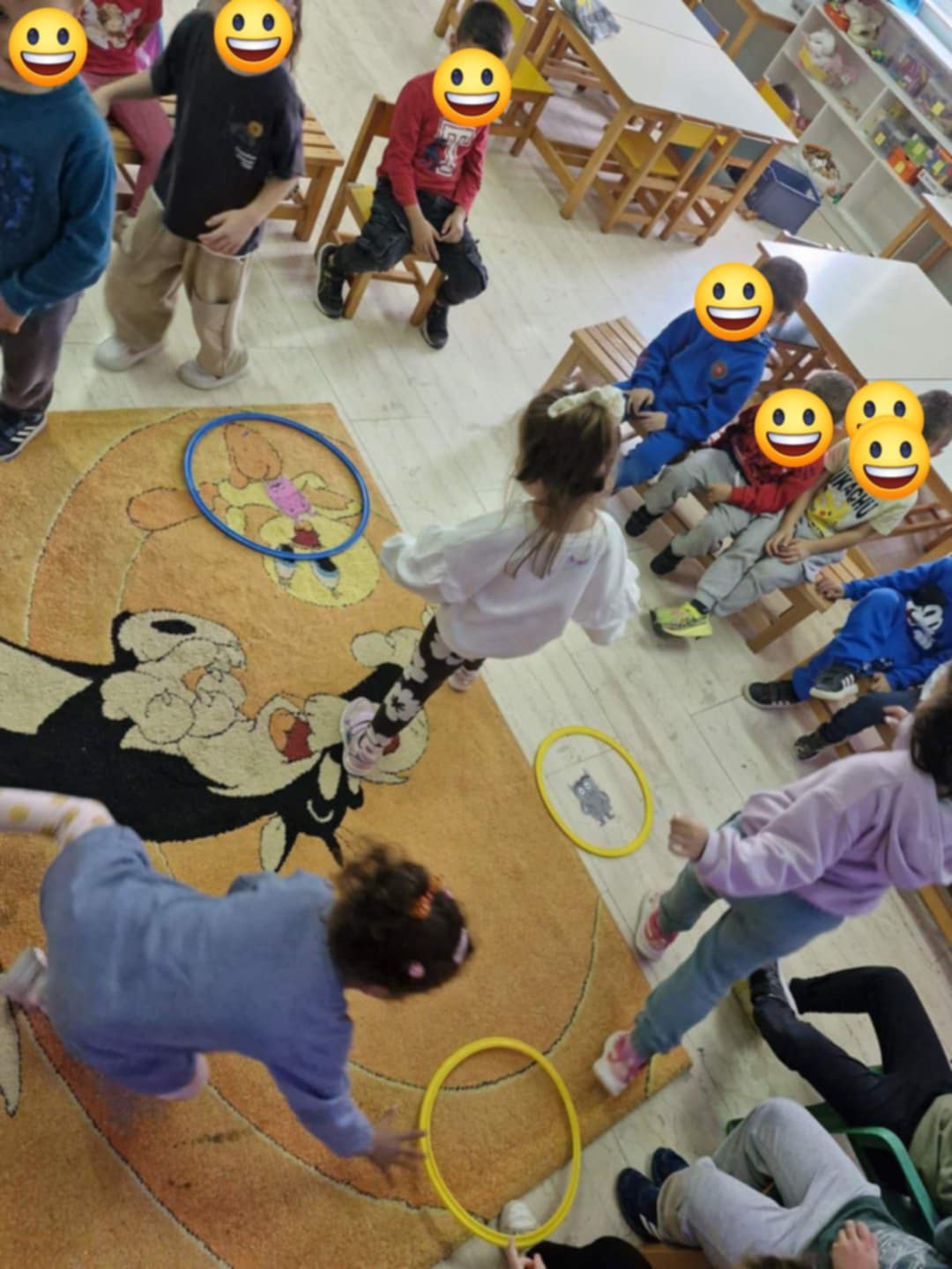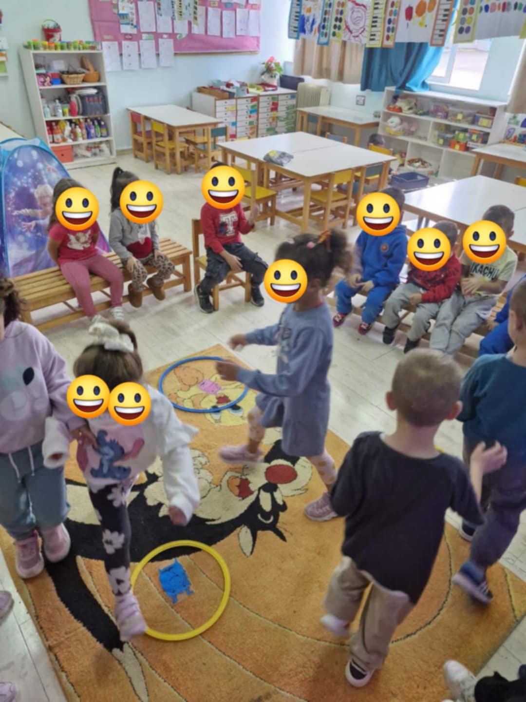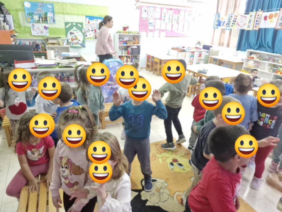 Παίξαμε ψυχοκινητικά παιχνίδια με μουσική ανά ομάδες: μόλις σταματούσε η μουσική η εκπαιδευτικός έλεγε ένα συναίσθημα και τα παιδιά έπαιρναν την ανάλογη έκφραση και μουσικά στεφάνια και όταν σταματούσε η μουσική η εκπαιδευτικός έλεγε ένα συναίσθημα από τα τρία που ήταν στο δάπεδο και νικούσε όποιο παιδί έμπαινε πρώτο στο σωστό στεφάνι.