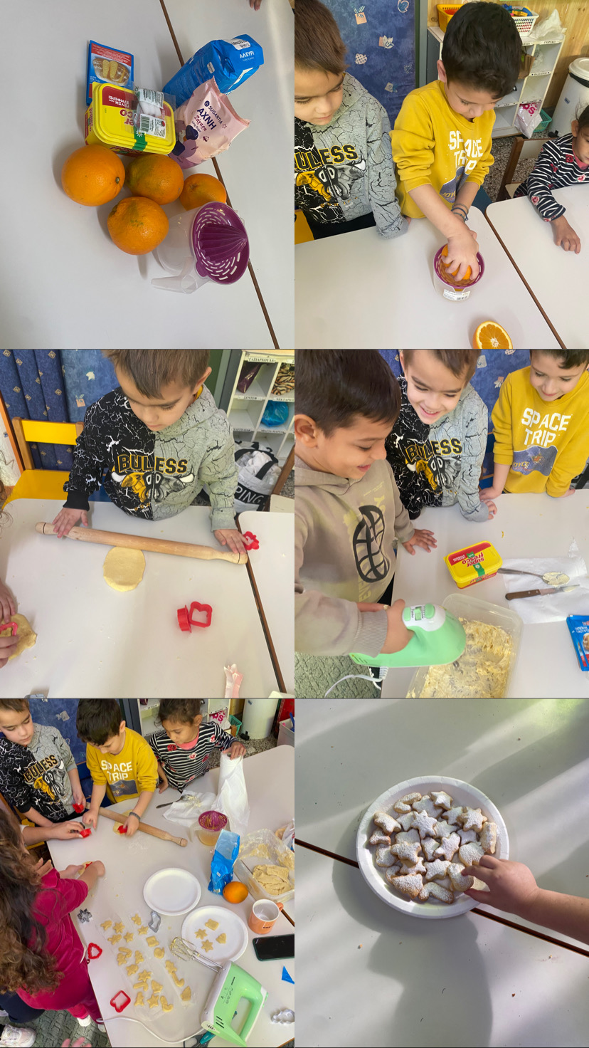 Τα Χριστούγεννα συνδέονται άμεσα με γεύσεις και αρώματα! Μαζί με τα παιδιά, συγκεντρώσαμε υλικά και μιλήσαμε για παραδοσιακές συνταγές. Ετοιμάσαμε γιορτινά γλυκίσματα, παρατηρήσαμε τα υλικά, μετρήσαμε ποσότητες και στο τέλος απολαύσαμε όλοι μαζί τα μπισκότα μας, πασπαλισμένα με άχνη ζάχαρη. Η δραστηριότητα αυτή συνδύασε μαθηματικές έννοιες, γλώσσα και αισθητηριακή εμπειρία.