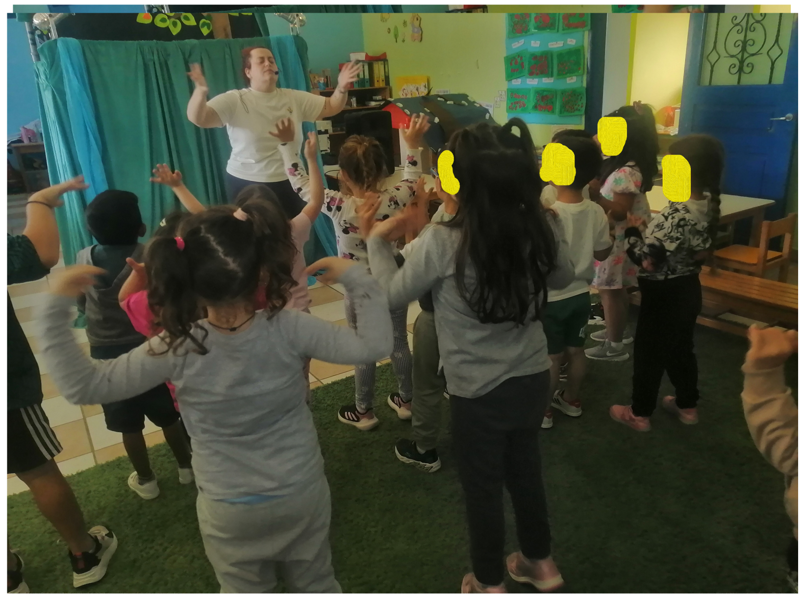 – Κάθε παιδί ζωγραφίζει την παλάμη του και γράφει μια υπόσχεση: «Θα σέβομαι τη φύση», «Θα φροντίζω το νέο μου σχολείο». Όλες οι παλάμες ενώνονται σε έναν πίνακα-κολάζ.