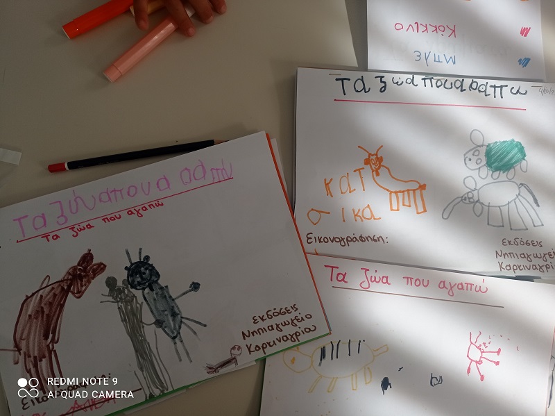 μιλήσαμε για τα αγαπημένα μας ζωάκια, διαβάσαμε το “Το ελαφάκι του δάσους” και αποφασίσαμε να διαχωρίσουμε τα ζωάκια ανάλογα με το που ζουν, δάσος, ζούγκλα, αυλή, θάλασσα…έτσι κόψαμε, κολλήσαμε, ομαδοποιήσαμε δημιουργήσαμε το πρώτο μας βιβλίο και συνεργαστήκαμε με πολύ ενθουσιασμό!
