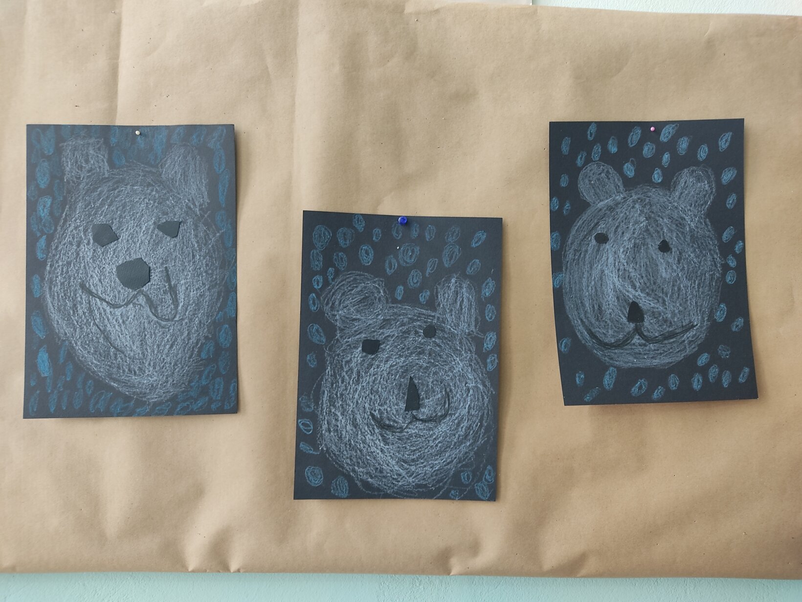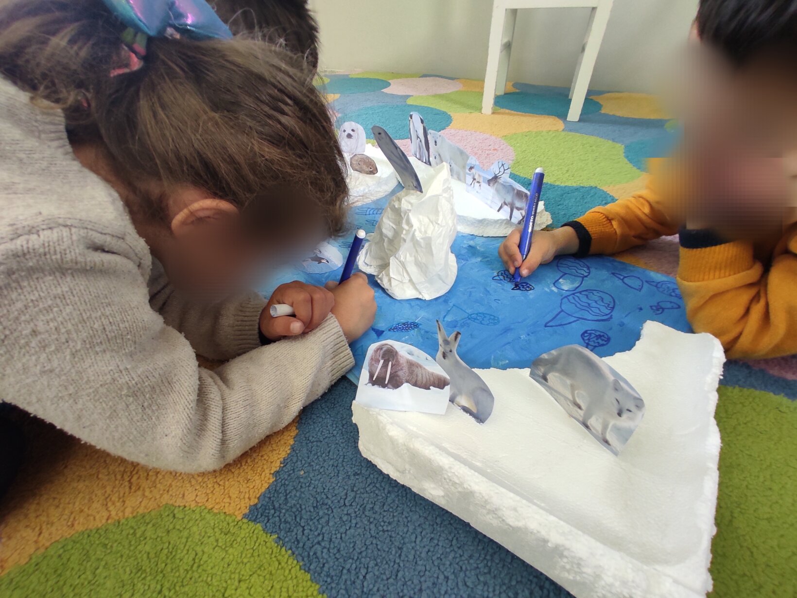 Εντοπίσαμε ζώα που ζουν στους πάγους και κάναμε εργασίες γραμματισμούΑξιοποιήσαμε τη γωνιά γραφής, ζωγραφίζοντας το αγαπημένο μας πολικό ζώο και γράφοντας το όνομά του