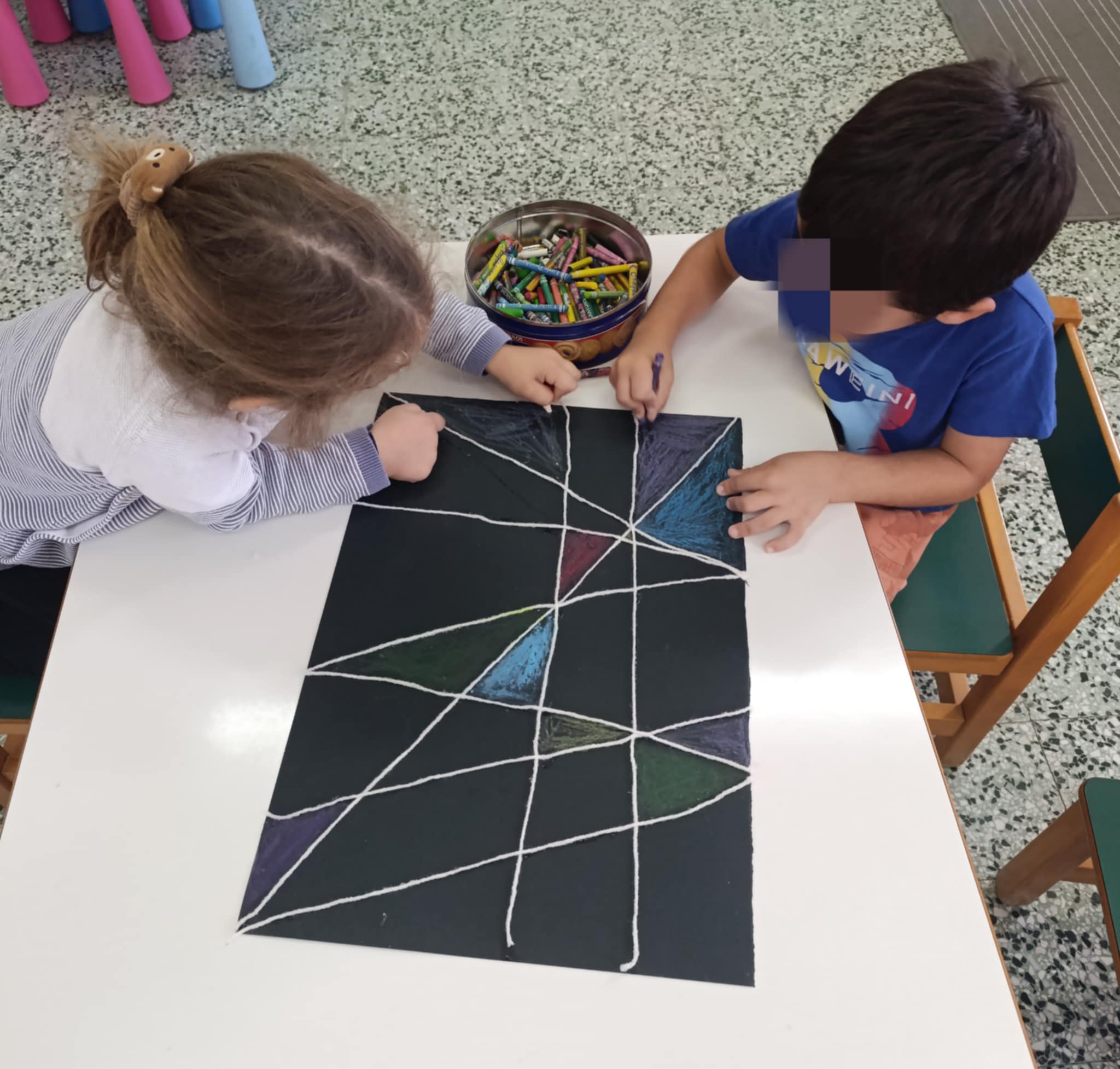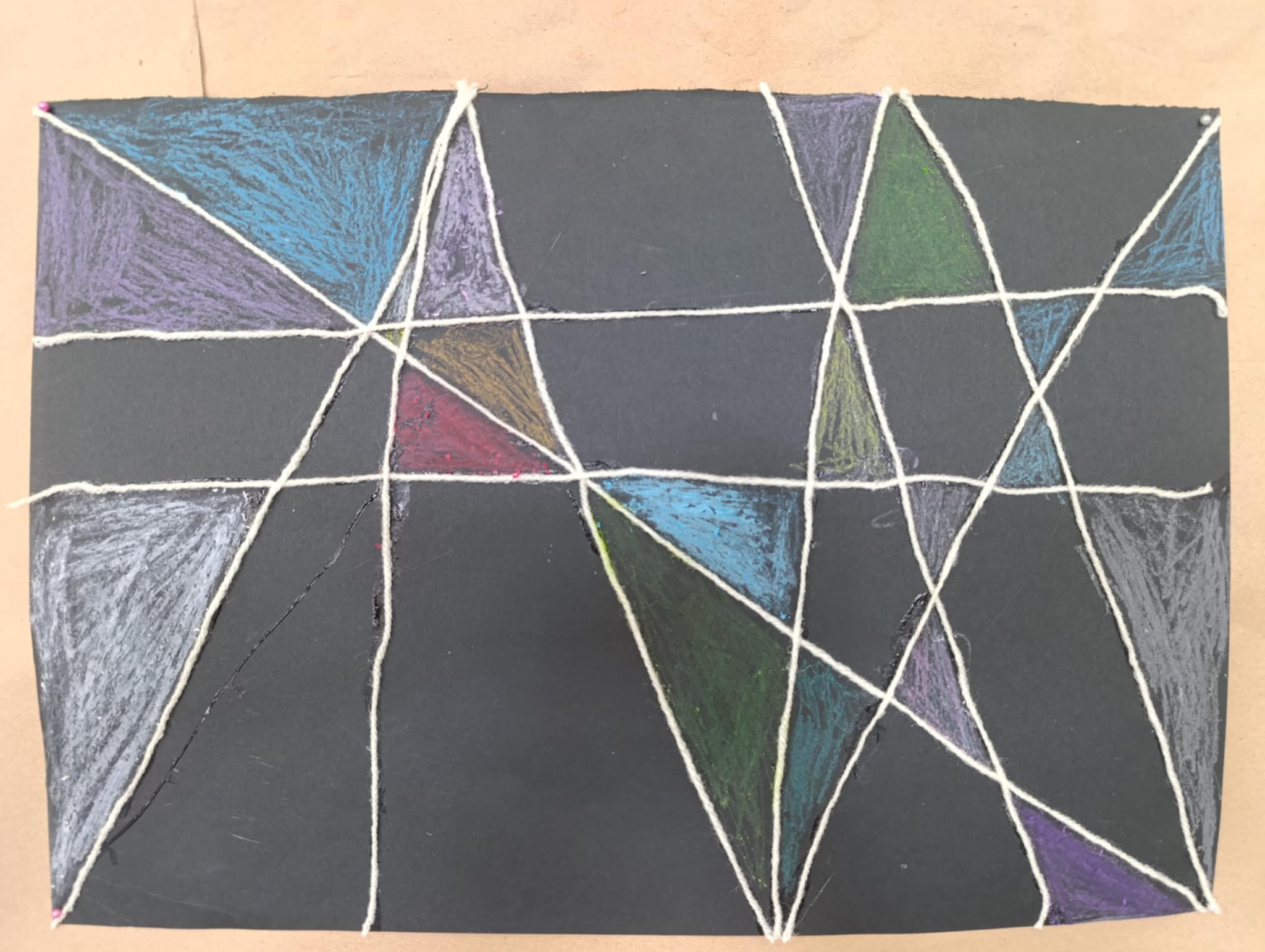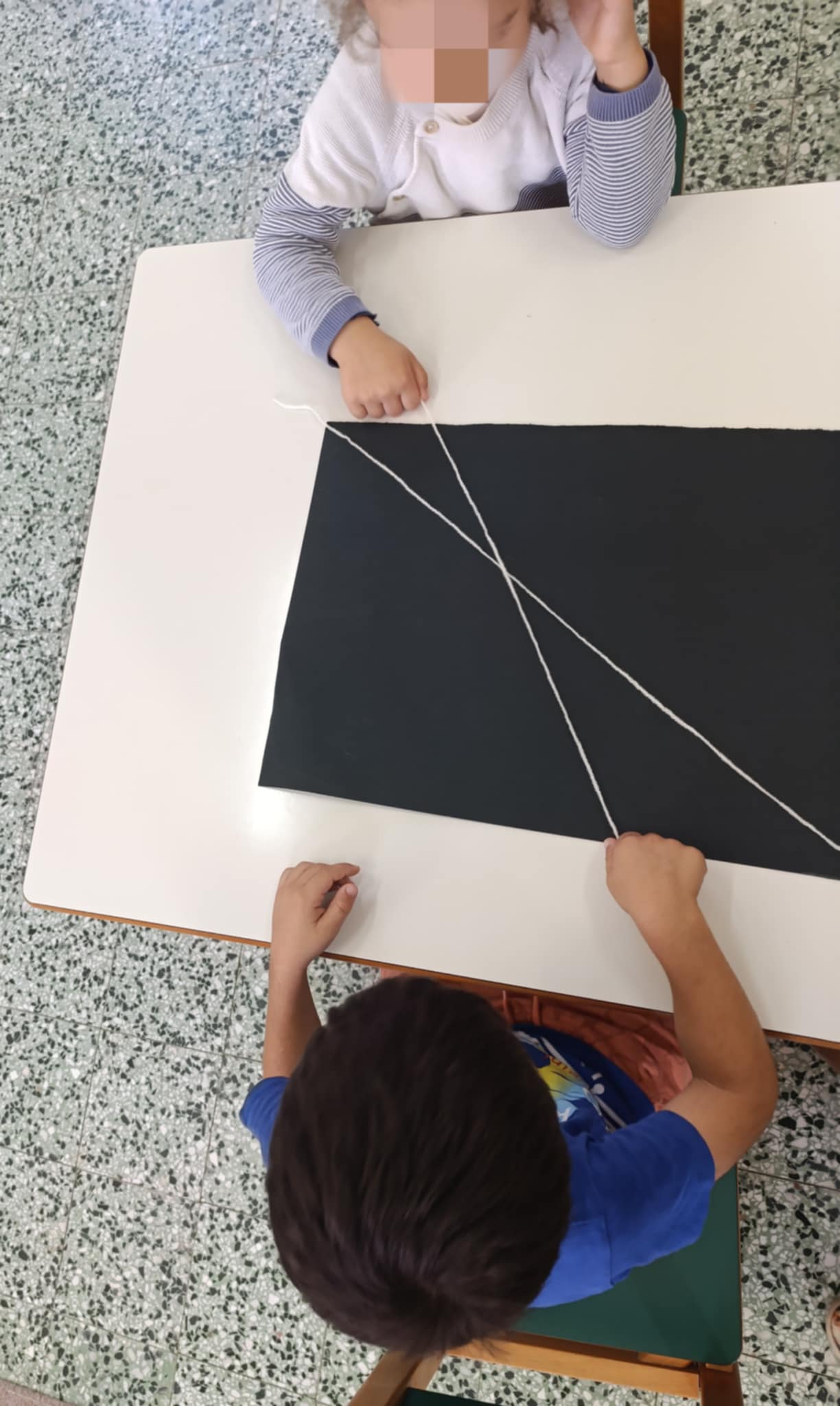 Είχαμε την ιδέα να τραβήξουμε ίσιες γραμμές με μια κλωστή πάνω σε ένα χαρτόνι. Παρατηρήσαμε τι συνέβη και ανακαλύψαμε τα τρίγωνα που εμφανίστηκαν.