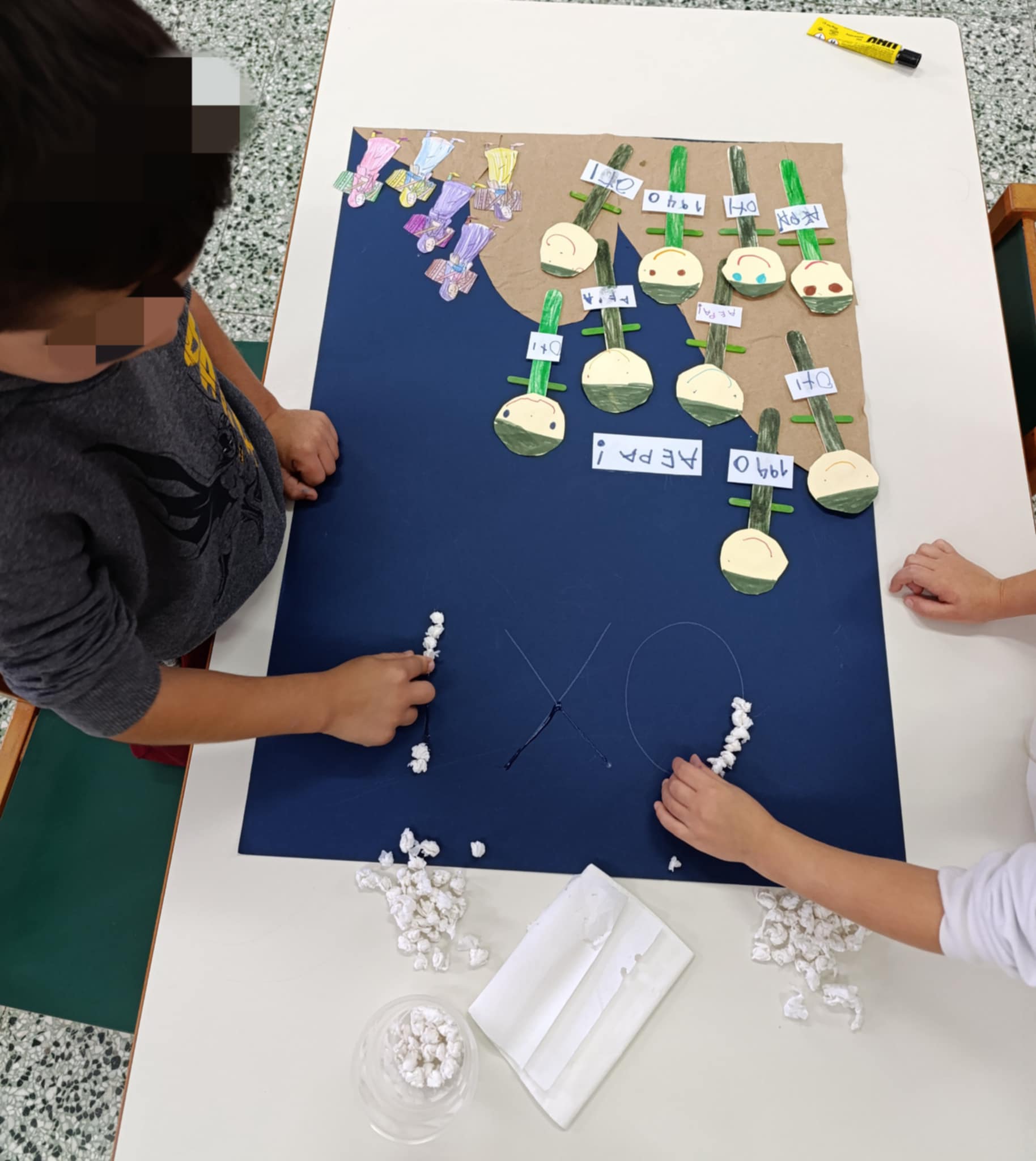 Παρατηρήσαμε τη λέξη ΟΧΙ, αναγνωρίσαμε τις φωνούλες της, την ανασυνθέσαμε, την γράψαμε, τη σχηματίσαμε με κολλάζ, την κάναμε κάδρο.
