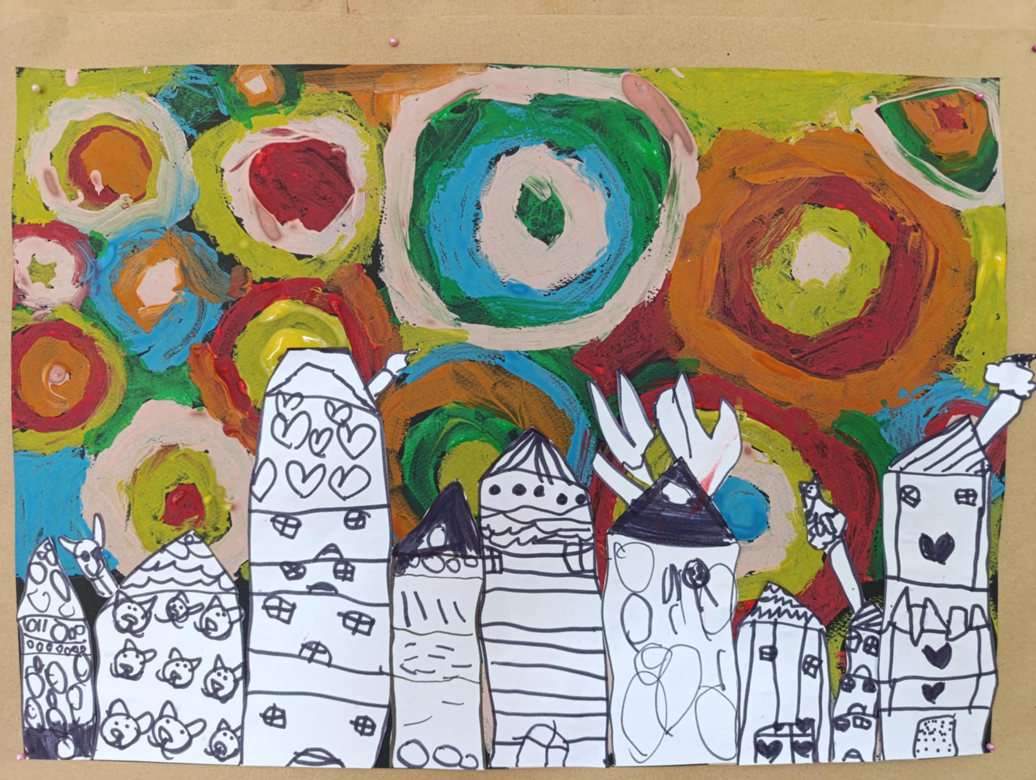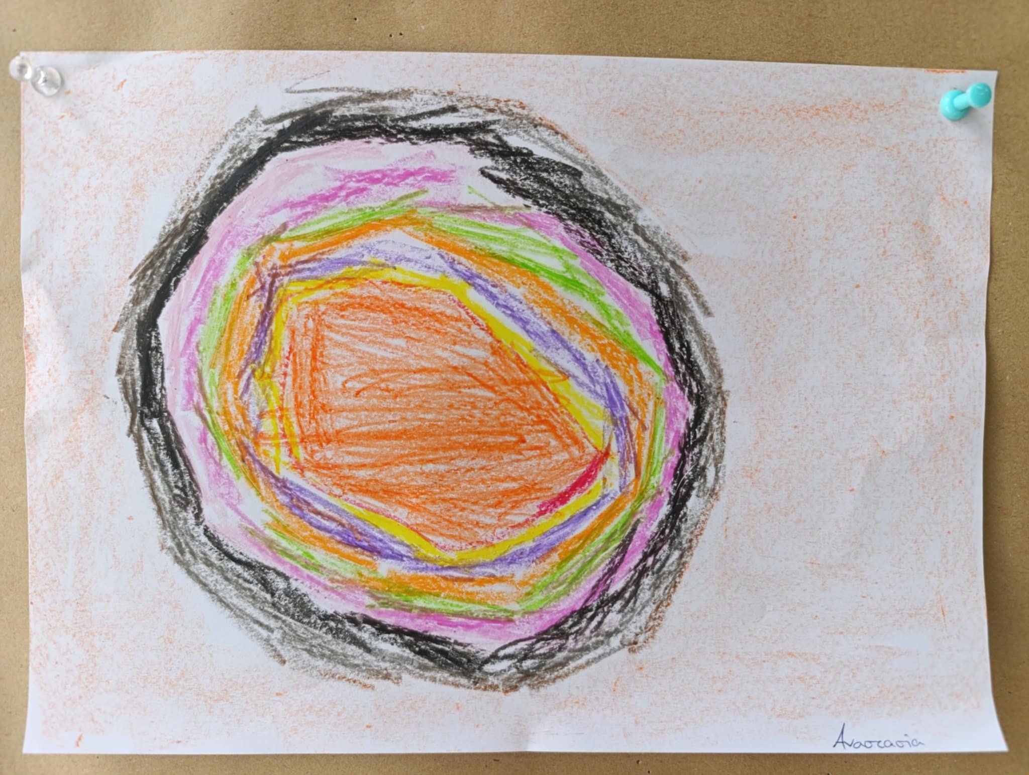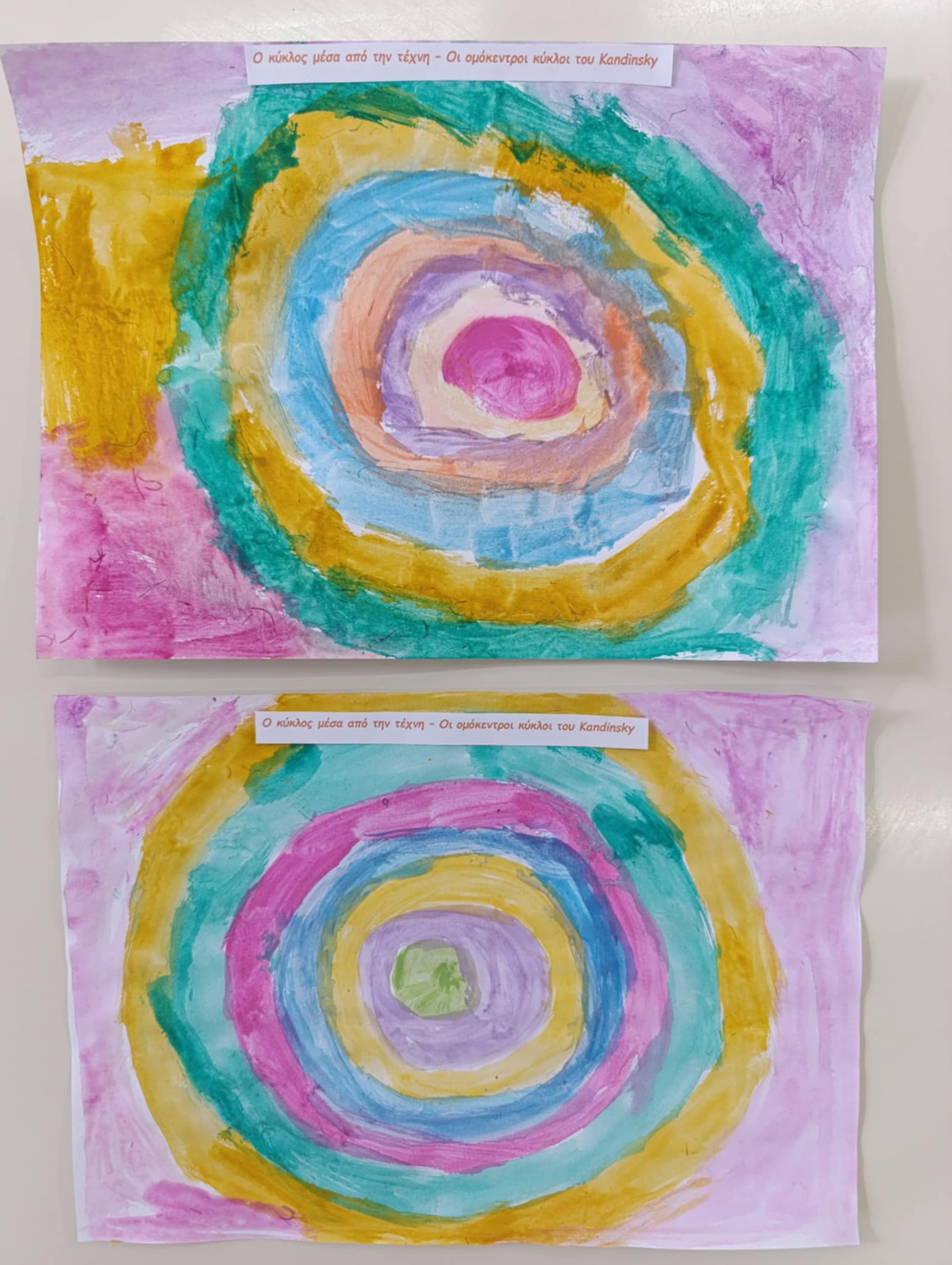 Παρατηρήσαμε έργα τέχνης με κύκλους και έτσι γνωρίσαμε τον Klimt και τον Kandinsky, αναγνωρίσαμε το σχήμα του κύκλου στα έργα τους, μετρήσαμε πόσους κύκλους βλέπουμε, επεξεργαστήκαμε τα χρώματα τους.