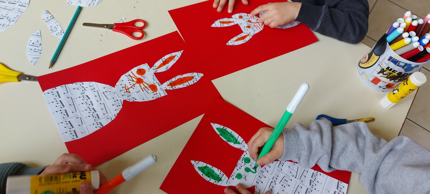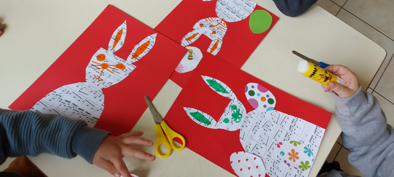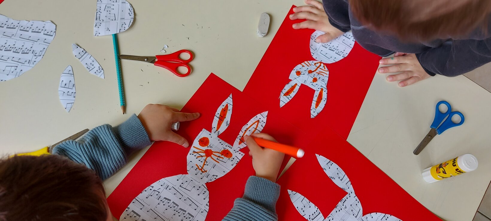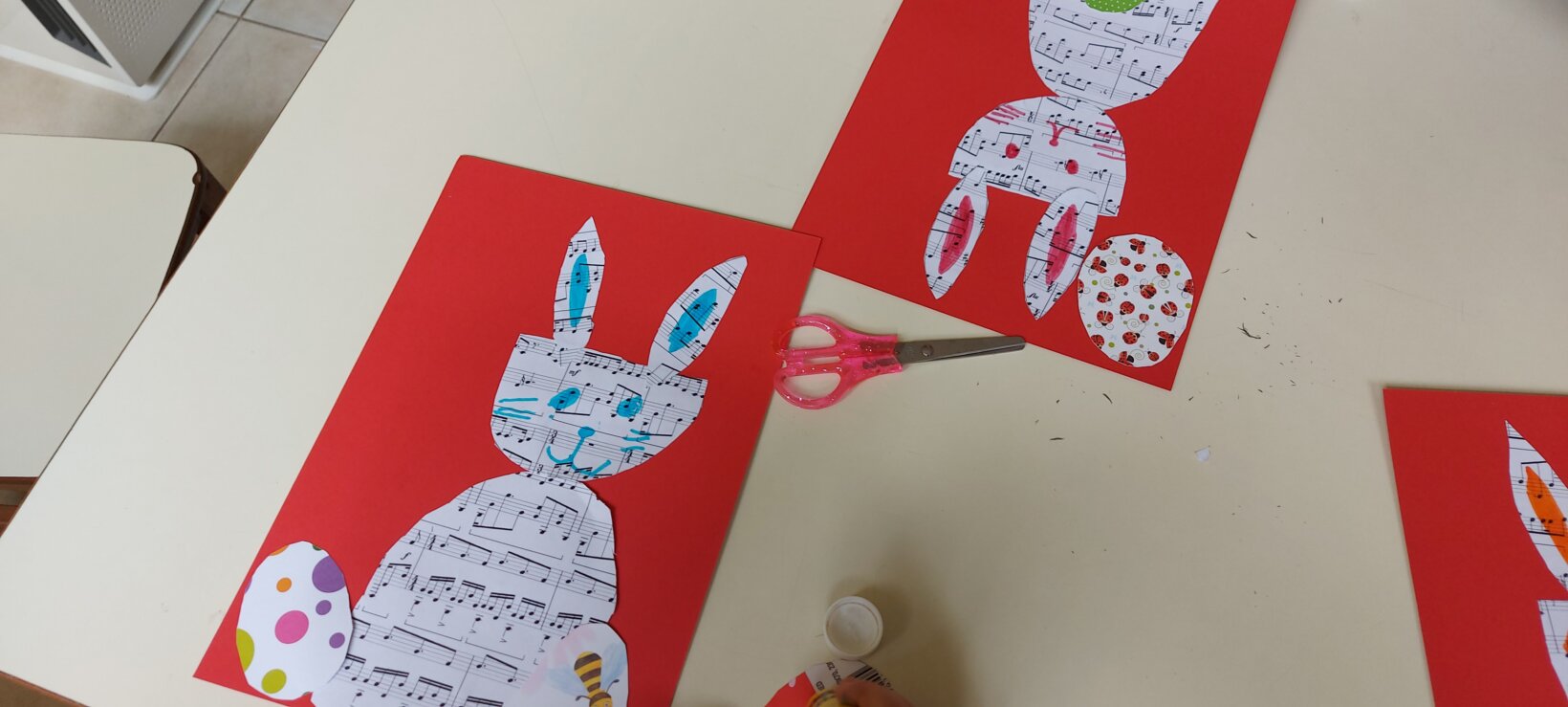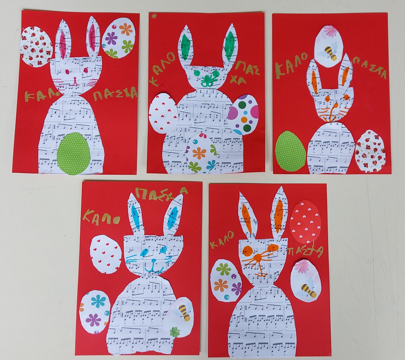 Τα παιδιά σχεδιάσαν κουνελάκια πάνω σε παρτιτούρες και τα έκοψαν. Σχεδίασαν το πρόσωπο με χρώμα της επιλογής τους. Στη συνέχεια έκοψαν αυγά με σχέδια από χαρτόνια της επιλογής τους,τα κόλλησαν όπως ήθελαν κι έγραψαν Καλό Πάσχα!