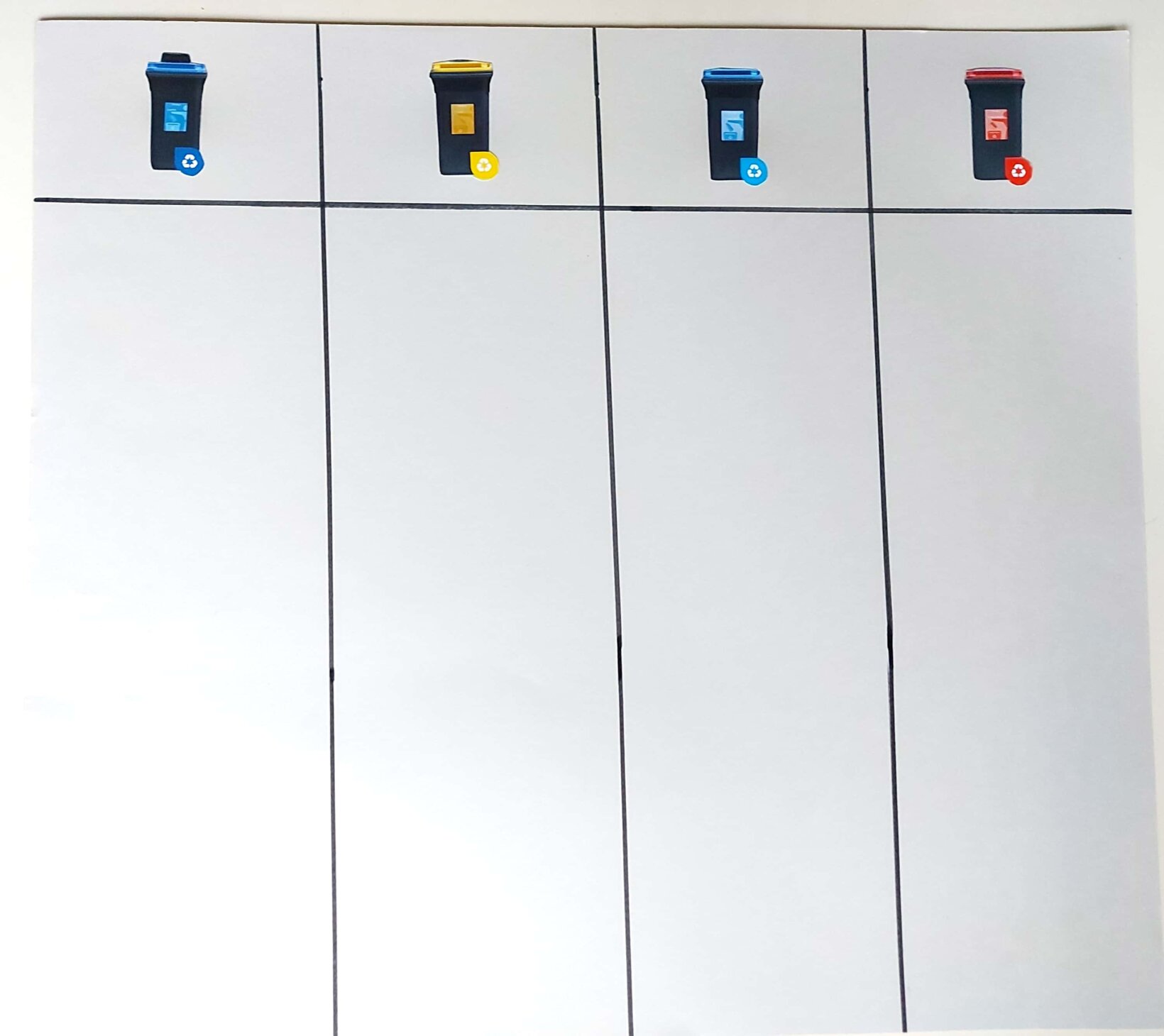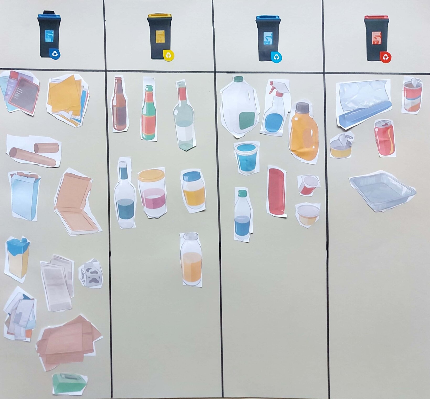 Στο πλαίσιο του 2ου Εργαστηρίου Δεξιοτήτων “Μη γεμίζεις με σκουπίδια τη Γη, ανακύκλωσε κι εσύ”, δημιουργήθηκε ένας πίνακας με τους κάδους που έχουμε δει σε προηγούμενα εργαστήρια κι έπειτα από την επίσκεψη της ΔΙΑΔΥΜΑ. Τα παιδιά έκοψαν εικόνες από ανακυκλώσιμα υλικά και τα κόλλησαν στη στήλη με τον κάδο που πρέπει να τα ρίξουμε για να ανακυκλωθούν.