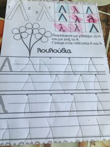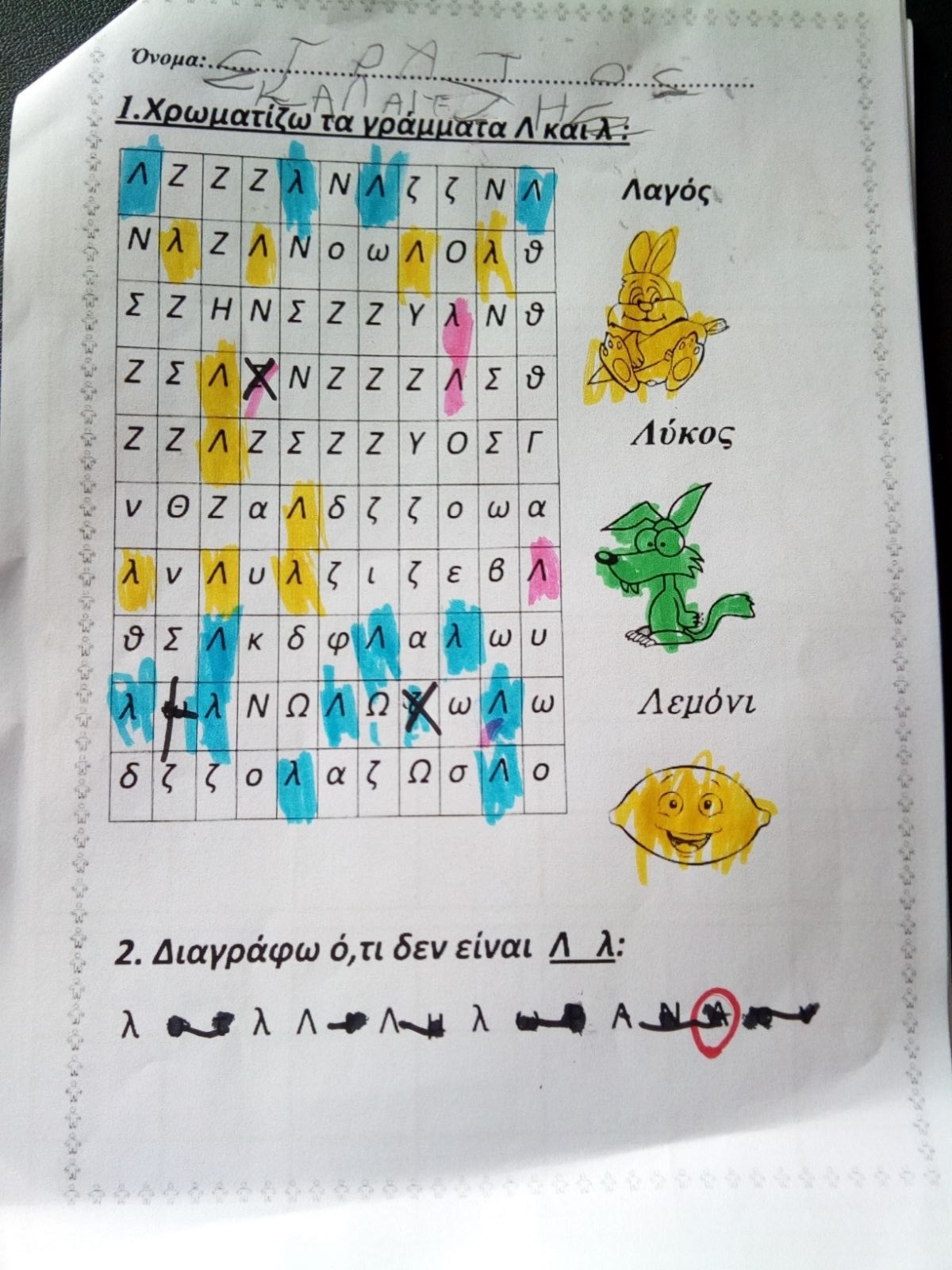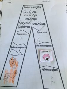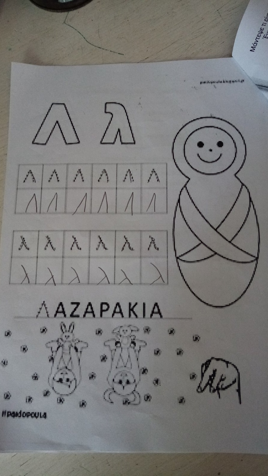 Έπειτα πάρε ένα λευκό χαρτί και γράψε πολλές φορές όπως μπορείς Λ ,λ .Από κάτω ζωγράφισε κάτι που αρχίζει από Λ.λ.