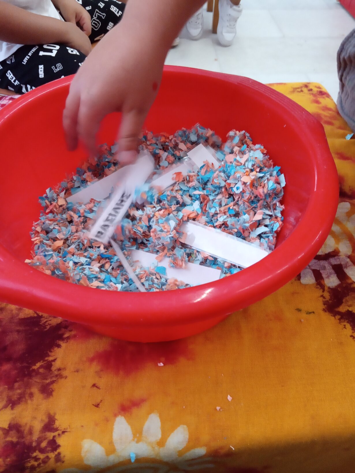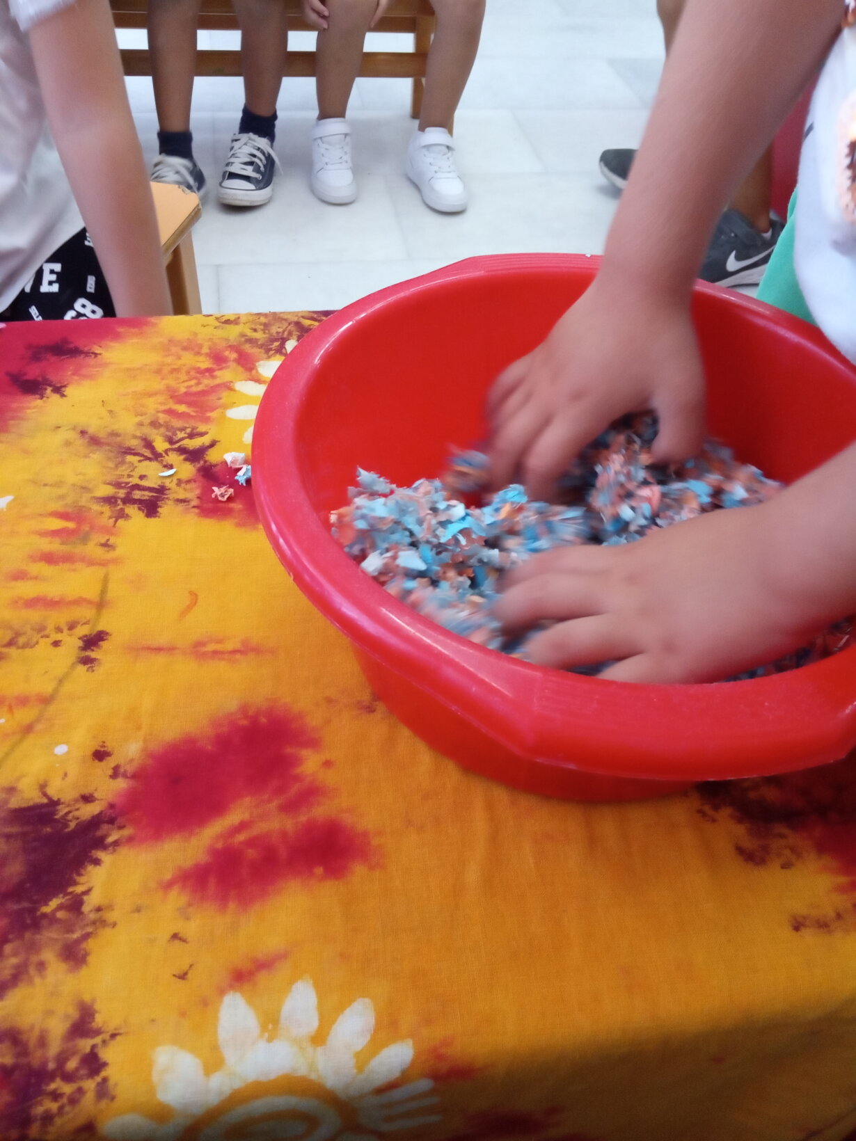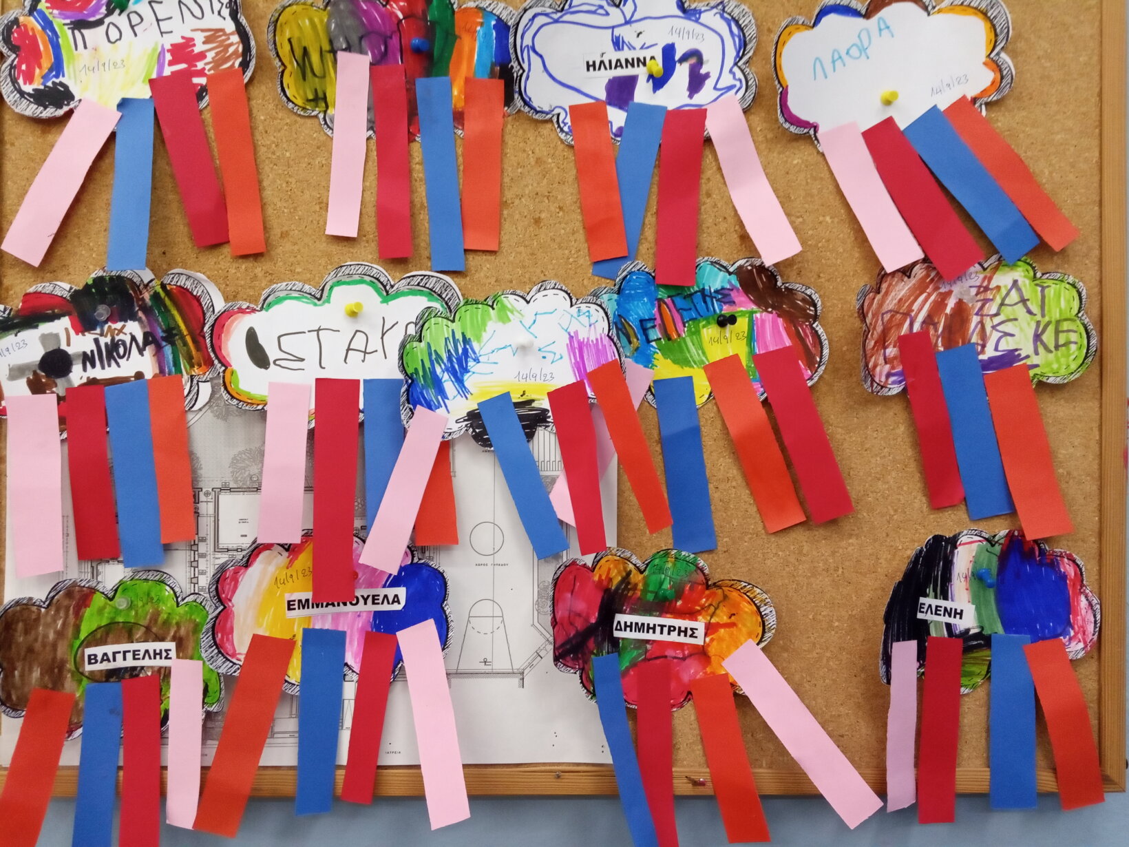 Το παιχνίδι του κρυμμένου θησαυρού, κάθε φορά που έβρισκαν ένα στοιχείο, έπαιρναν το χαρτάκι με το χρώμα που αντιστοιχούσε στο στοιχείο και όταν πήραν τα χαρτάκια από όλα τα στοιχεία έφτιαξαν το συννεφάκι ουράνιο τόξο με το όνομα τους.