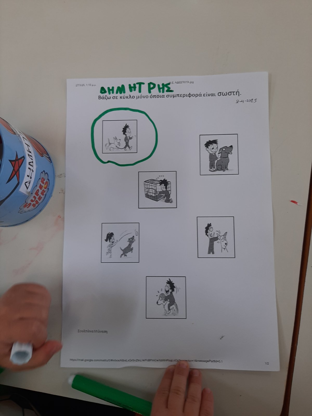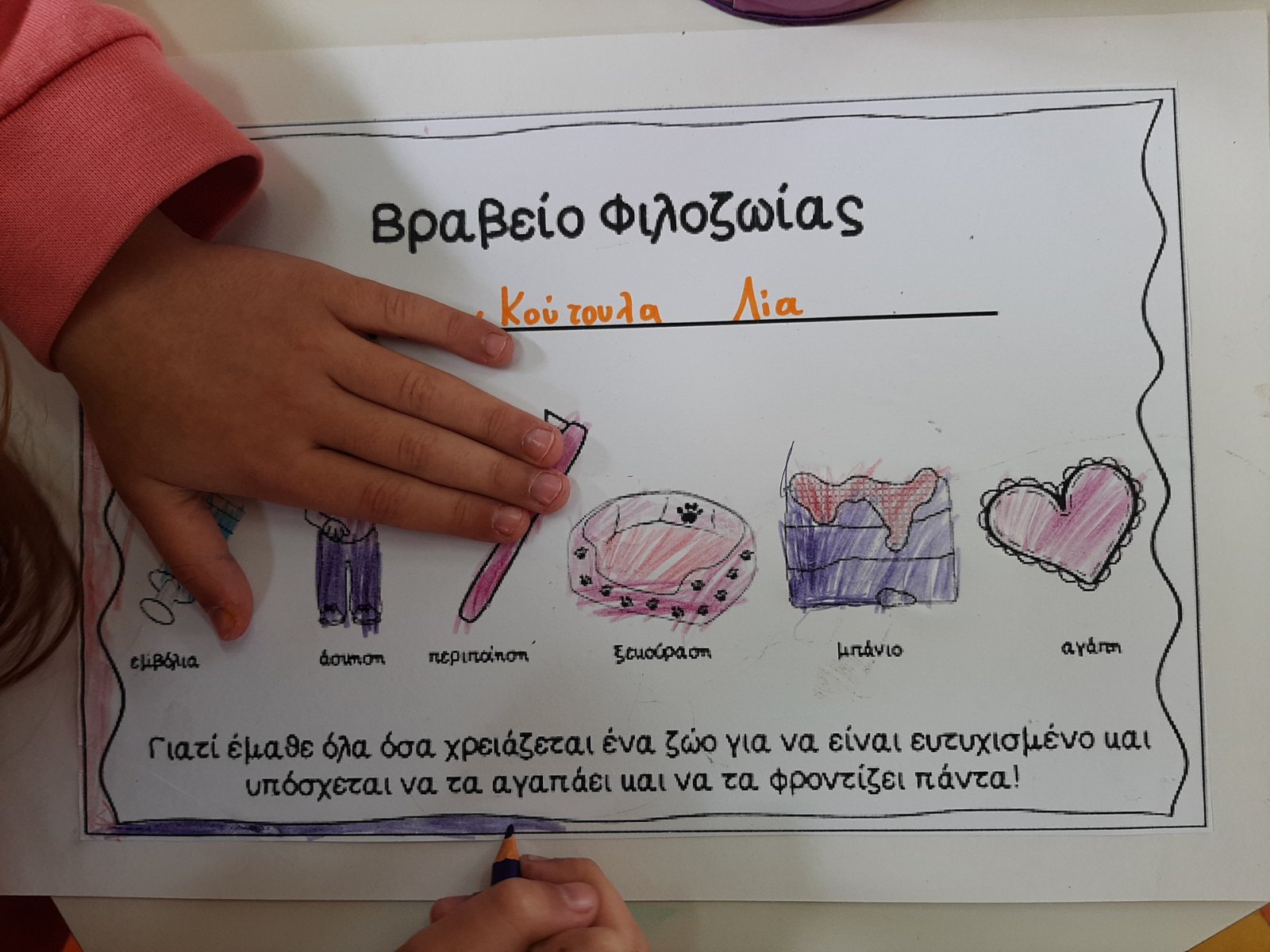 ΔΡΑΣΕΙΣ ΕΝΕΡΓΟΥ ΠΟΛΙΤΗ – ΦΙΛΟΖΩΙΑ – ΑΔΕΣΠΟΤΑ ΖΩΑ : Σήμερα παρακολουθησαμε σχετικά βίντεο που στοχεύουν να ευαισθητοποιησουν τα παιδιά για τα αδέσποτα ζώα, να γνωρίσουν τις ανάγκες τους (τροφή, νερό, στέγη, φροντίδα, αγαπη, ιατρική περίθαλψη) και να αναπτύξουν ενσυναισθηση απέναντι τους. Συζητήσαμε αναλυτικά με τους μαθητές και τις μαθήτριες τι μπορούμε να κάνουμε ως ΕΝΕΡΓΟΙ ΠΟΛΙΤΕΣ για τα αδέσποτα ζώα: 1) Να εξασφαλίζουμε ώστε τα αδέσποτα της γειτονιάς μας να έχουν τροφή και καθαρό νερό. 2) Να τα φιλοξενούμε όταν έχει πολύ κρύο ή πολύ ζέστη. 3) Να μην αγοράζουμε γάτες ή σκυλιά αλλά να υιοθετουμε αδεσποτακια. 4) Να ενημερώνουμε το Δήμο για την παρουσία αδέσποτων στη γειτονιά ώστε να τα στειρωνει. 5) Να τα πηγαίνουμε σε φιλοζωικες εταιρείες ή σε καταφύγια ζώων αν εντοπίσουμε κάποιο κακοποιημένο ή τραυματισμενο αδεσποτακι. 6) Να καταγγελουμε κάθε βίαιη συμπεριφορά ή κακοποίηση αδέσποτων ζώων στις αρμόδιες αρχές. Στη συνέχεια, συμπληρωσαμε ένα φύλλο εργασίας όπου κυκλωσαμε όποια συμπεριφορά είναι σωστή. Μετά από όλα αυτά νομίζουμε ότι μας αξίζει επάξια το ΒΡΑΒΕΙΟ ΦΙΛΟΖΩΙΑΣ.