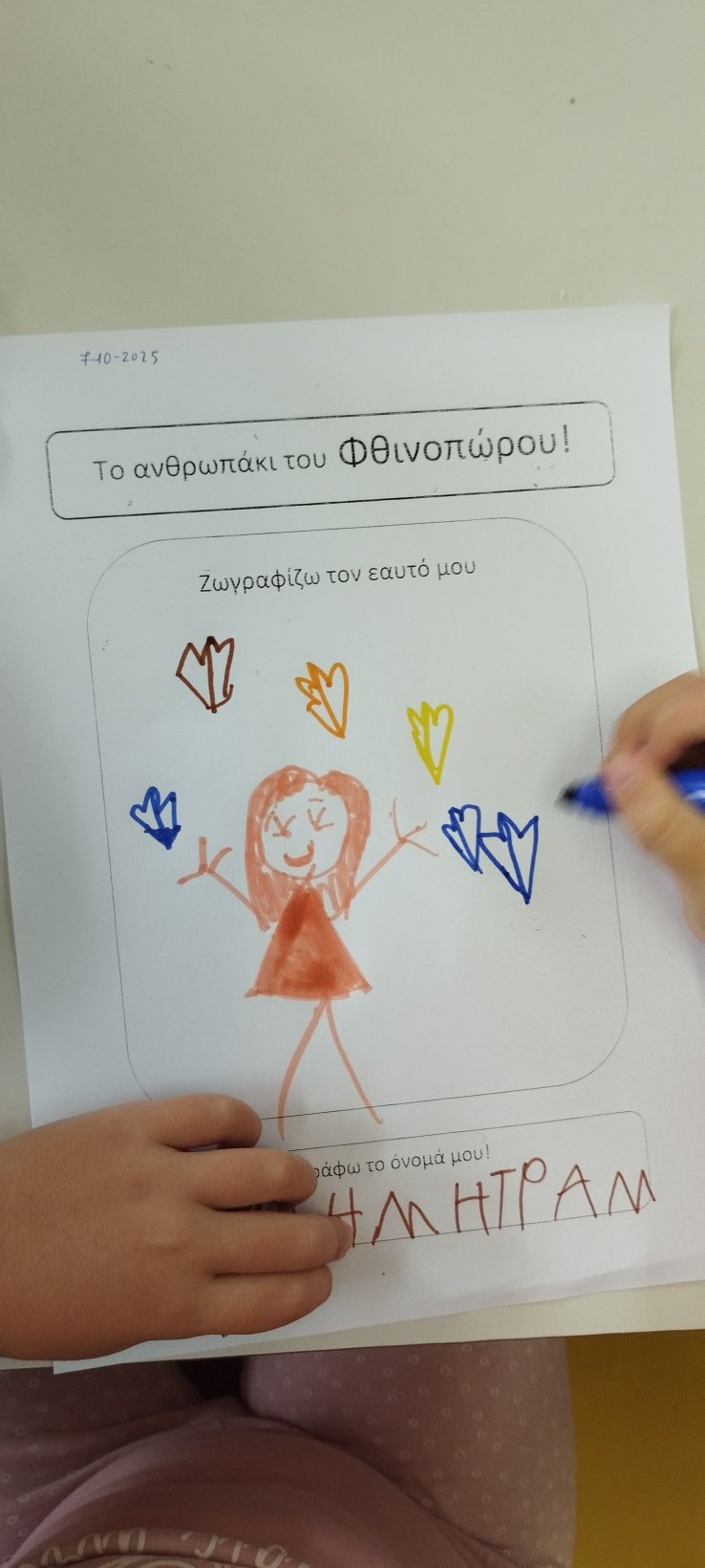 ΓΛΩΣΣΑ – ΜΕΛΕΤΗ ΠΕΡΙΒΑΛΛΟΝΤΟΣ Σήμερα κάναμε το “Ανθρωπάκι του Φθινοπώρου”! 🍁 Τα παιδιά ζωγράφισαν τον εαυτό τους όπως είναι τώρα, το φθινόπωρο — με τα ρούχα, τα χρώματα και τη διάθεση της εποχής. Αργότερα θα δημιουργήσουμε και το “Ανθρωπάκι του Χειμώνα”, της Άνοιξης και του Καλοκαιριού. Ζητήσαμε από τα παιδιά να γράψουν και το όνομά τους. Η εργασία αυτή έδωσε την ευκαιρία στα παιδιά να παρατηρήσουν τις αλλαγές που φέρνει το φθινόπωρο στη φύση και στον εαυτό μας, να εκφραστούν δημιουργικά μέσα από τη ζωγραφική και να ενισχύσουν τη φωνολογική τους επίγνωση γράφοντας το όνομά τους. Παράλληλα, καλλιέργησαν την παρατηρητικότητα, τη λεπτή κινητικότητα και την αυτοαντίληψη, καθώς προσπάθησαν να αποτυπώσουν τον εαυτό τους με τα χαρακτηριστικά της εποχής. Μέσα από τη συζήτηση και την ομαδική εργασία, ενισχύθηκε και η επικοινωνία και η συνεργασία μεταξύ των παιδιών. 🍂