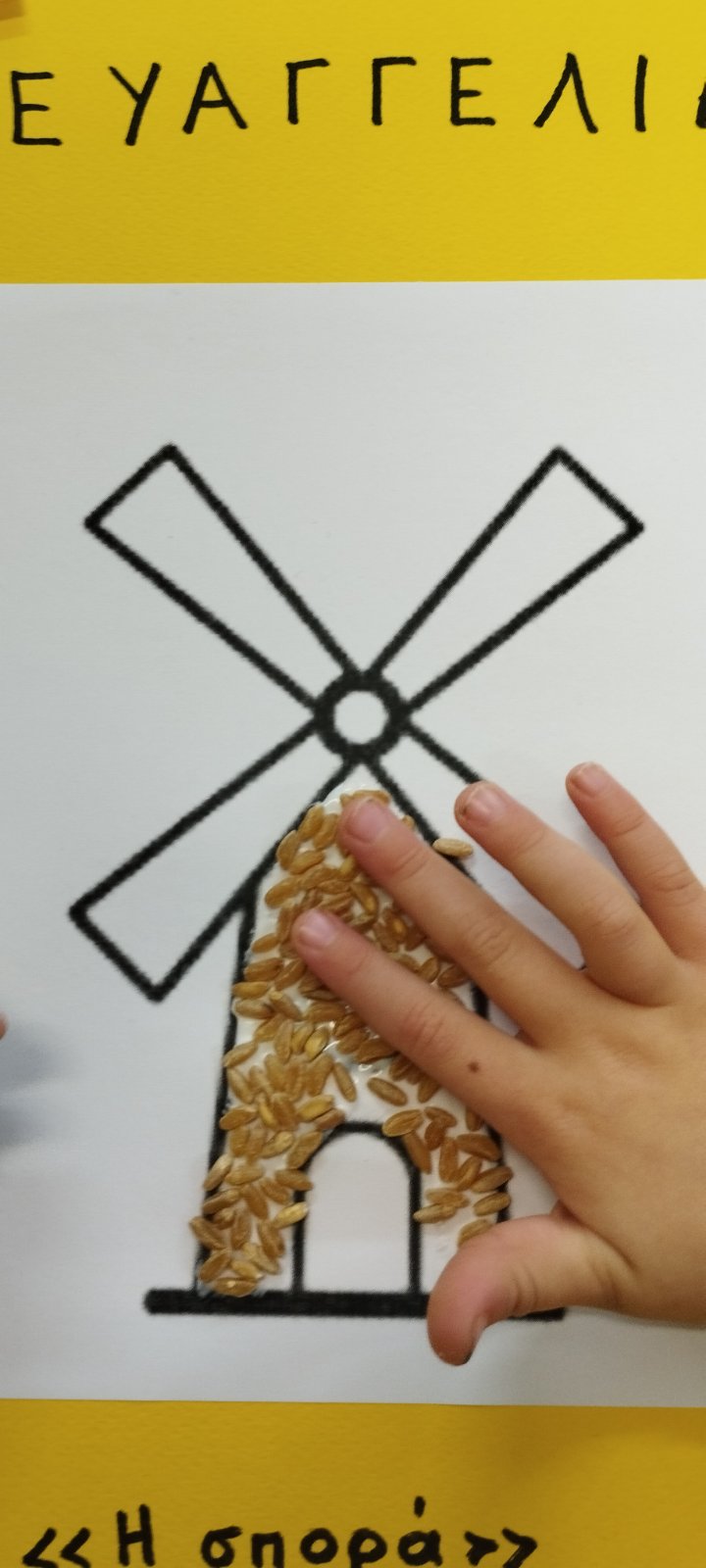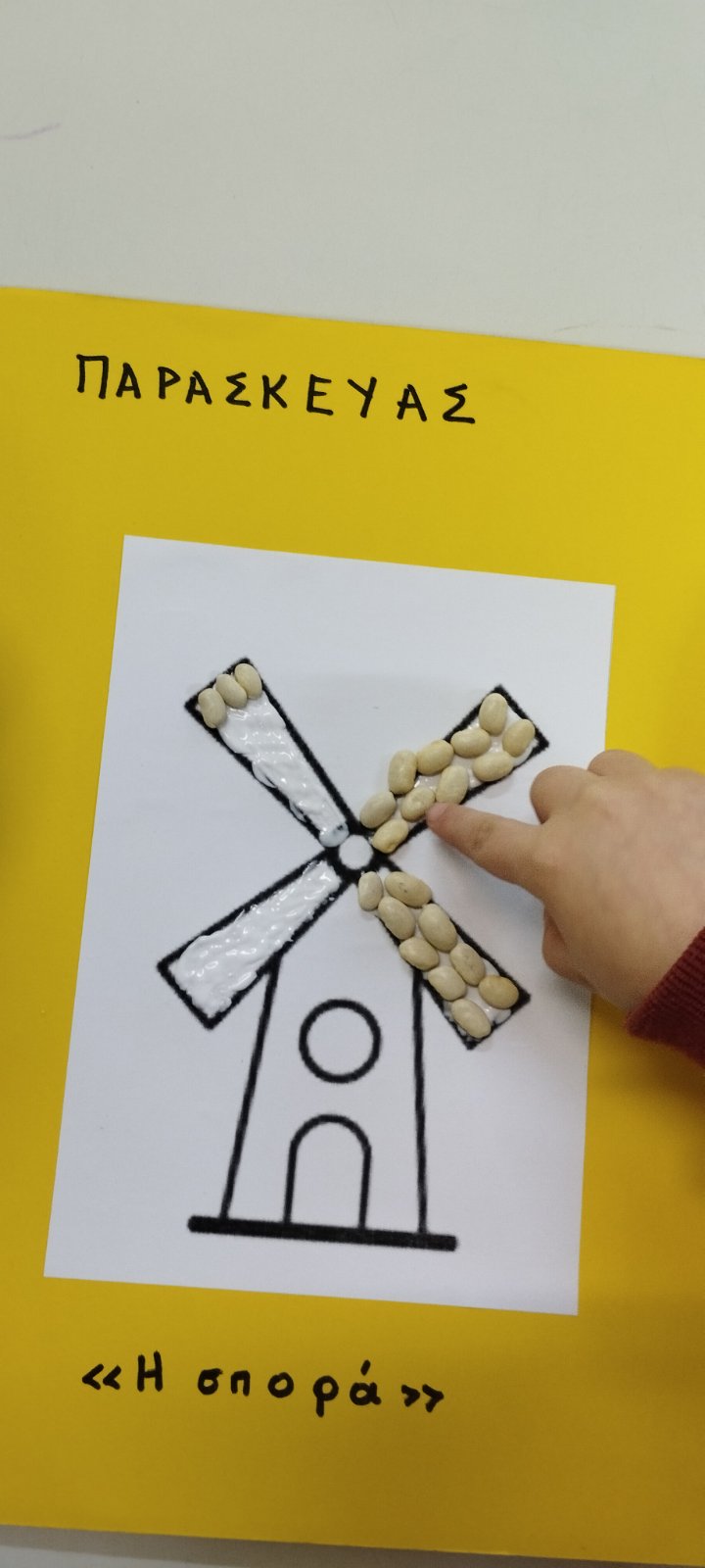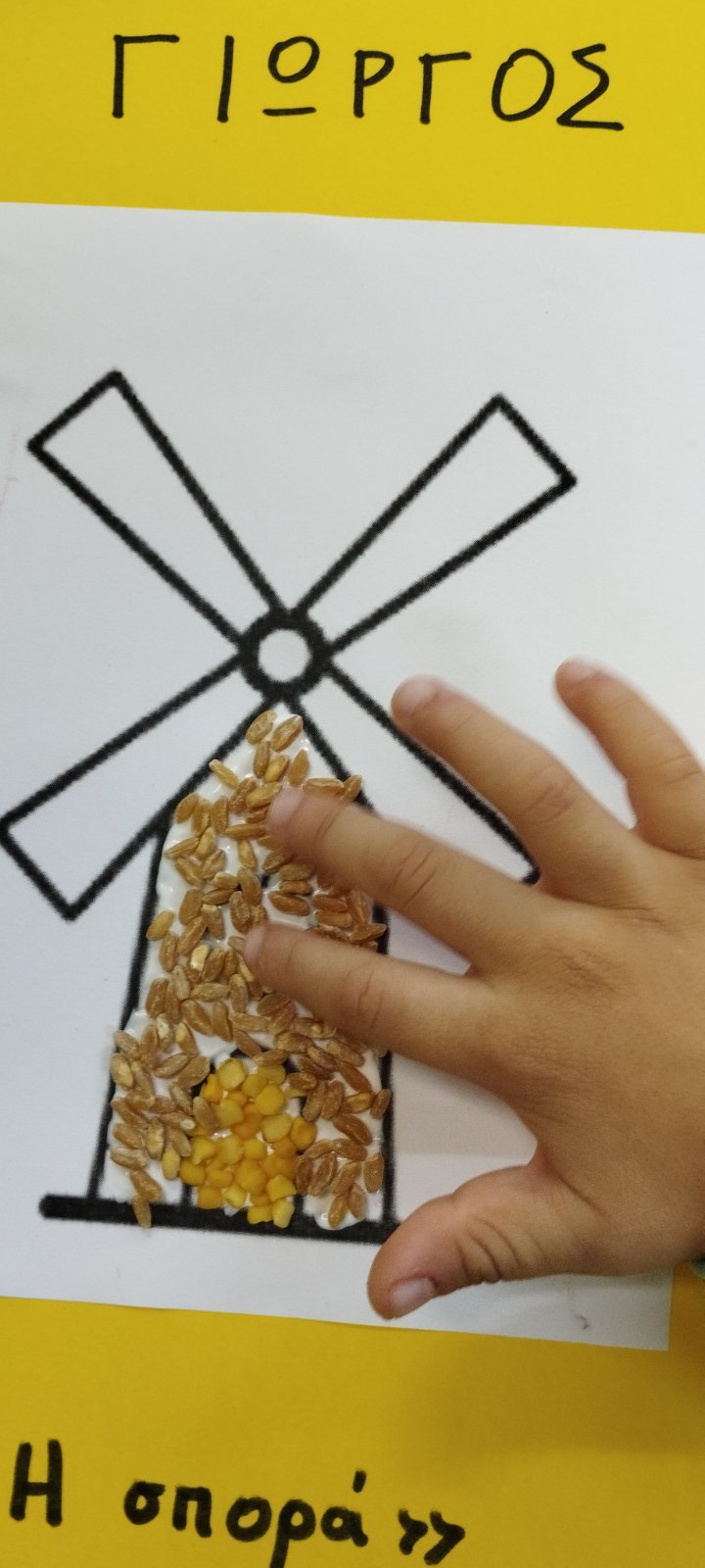 ΔΗΜΙΟΥΡΓΙΑ & ΕΚΦΡΑΣΗ: ΚΟΛΑΖ ΜΕ ΣΠΟΡΟΥΣ. Από το σπόρο… στο ψωμί: Ένας ανεμόμυλος φτιαγμένος από σπόρους! Στο νηπιαγωγείο μας συνεχίζουμε με ενθουσιασμό το project «Από το σπόρο στο ψωμί», ένα ταξίδι γεμάτο ανακαλύψεις, πειραματισμούς και δημιουργική μάθηση. Στο πλαίσιο αυτής της θεματικής, τα παιδιά είχαν την ευκαιρία να γνωρίσουν από κοντά διάφορους σπόρους και να ανακαλύψουν τη διαδρομή που ακολουθεί κάθε σποράκι μέχρι να φτάσει στο πιάτο μας. Με συζήτηση, παρατήρηση και πειραματισμούς, τα παιδιά αναγνώρισαν τρεις βασικούς σπόρους: σιτάρι, φάβα και φασόλια. Τα άγγιξαν, τα ταξινόμησαν και έκαναν υποθέσεις για το πού χρησιμοποιείται ο καθένας και πώς μεταμορφώνεται μέσα στον κύκλο παραγωγής. Αξιοποιώντας την έμπνευση που προέκυψε από το ταξίδι του σπόρου μέχρι την παραγωγή αλευριού, τα παιδιά δημιούργησαν ένα εντυπωσιακό κολάζ ανεμόμυλου χρησιμοποιώντας αποκλειστικά τους σπόρους που μελέτησαν. Πάνω στο χαρτόνι κολληθηκε το περίγραμμα ενός ανεμόμυλου – συμβολίζοντας το στάδιο άλεσης του σιταριού – και τα παιδιά γέμισαν κάθε τμήμα του με διαφορετικά είδη σπόρων, δίνοντας χρώμα, υφή και ζωή στο έργο. Με αυτή τη δραστηριότητα τα παιδιά: Ανέπτυξαν τη λεπτή κινητικότητα και τον συντονισμό χεριού–ματιού Εξοικειώθηκαν με φυσικά υλικά και αισθητηριακές υφές Κατανόησαν τη λειτουργία του ανεμόμυλου και τη σχέση του με την παραγωγή αλευριού Βίωσαν τη μάθηση μέσα από μια δημιουργική και συνεργατική διαδικασία. Το αποτέλεσμα ήταν ένας μοναδικός ανεμόμυλος από σπόρους, γεμάτος χρώματα, αντιθέσεις και φαντασία — μια μικρή καλλιτεχνική υπενθύμιση της πορείας που ακολουθεί το σιτάρι μέχρι να γίνει ψωμί.