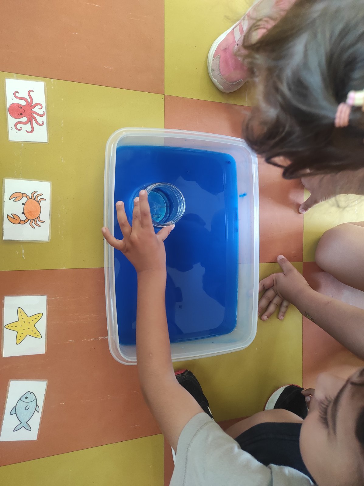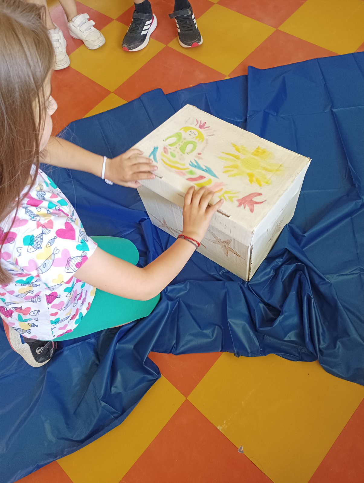 ΠΡΟΦΟΡΙΚΗ ΕΚΦΡΑΣΗ ΔΗΜΙΟΥΡΓΙΑ ΙΣΤΟΡΙΑΣ Στο νηπιαγωγείο μας, αφεθήκαμε στη μαγεία της μουσικής ακούγοντας το μελωδικό κομμάτι “Τα κύματα” του Σταμάτη Σπανουδάκη. Κάθε παιδί, με οδηγό τη φαντασία του, ταξίδεψε σε ένα δικό του φανταστικό προορισμό. Άλλοι επέλεξαν να ταξιδέψουν με καράβι, άλλοι με δελφίνι, άλλοι με αερόστατο ή ακόμα και με ένα τεράστιο κοχύλι που επέπλεε στα κύματα. Μέσα από τις διηγήσεις τους, πλάστηκαν μοναδικές ιστορίες γεμάτες χρώμα, ήχους της φύσης και θαλασσινή αύρα. Στη συνέχεια, ενώσαμε τις φαντασίες μας και δημιουργήσαμε μια ομαδική ιστορία. Φανταστήκαμε ότι ανακαλύψαμε ένα παλιό μπαούλο ξεβρασμένο στην ακροθαλασσιά. Το ανοίξαμε γεμάτοι προσμονή και μέσα του βρήκαμε πολύτιμους θησαυρούς της θάλασσας: κοχύλια, πετραδάκια, αστερίες . Τα παιδιά τα παρατήρησαν με θαυμασμό, τα μύρισαν, τα άγγιξαν απαλά και, βάζοντας τα κοχύλια στα αυτιά τους, άκουσαν τους ήχους των κυμάτων, αφήνοντας τη φαντασία τους να ταξιδέψει ξανά στον κόσμο του βυθού.