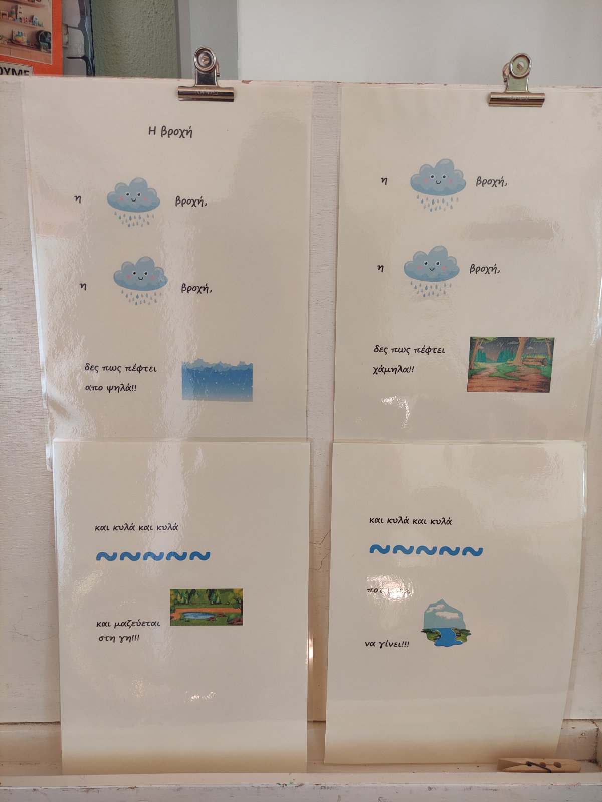 - ήρθαμε σε επαφή με τη βροχούλα, βγήκαμε έξω στην αυλή, μάθαμε για την πορεία της, έμαθαν να συνθέτουν το τραγουδάκι βάζοντας τις εικόνες στη σωστή σειρά και παίξαμε μαζί της δραματοποιώντας το τραγούδι.
