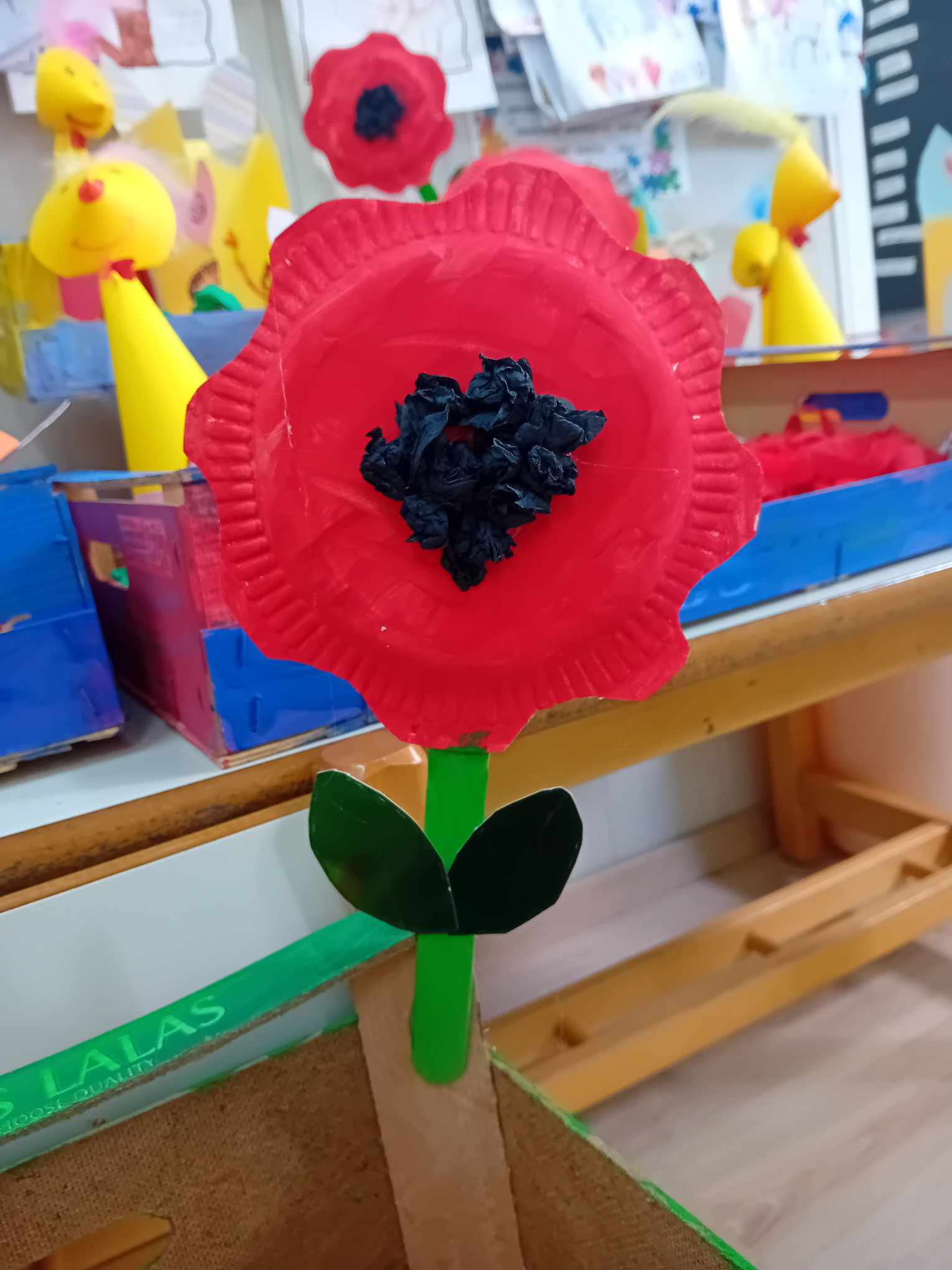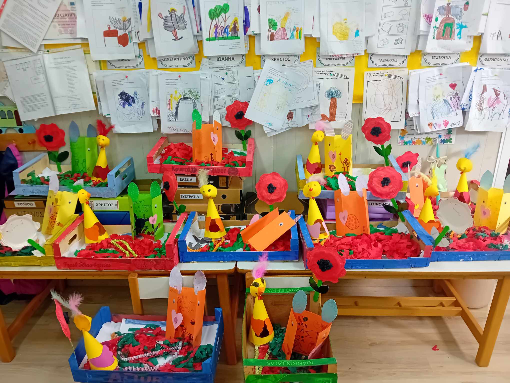 Στη συνέχεια, κατασκευάσαμε τις πασχαλινές μας κάρτες σε σχήμα λαγού και γράψαμε τις ευχές μας. Επίσης, τα παιδιά έβαψαν τα ξύλινα καλάθια, που είχαμε ήδη προμηθευτεί, στο χρώμα της επιλογής τους, κόψανε “χορταράκι” από γκοφρέ χαρτί ώστε στο τέλος να τοποθετήσουμε μέσα όλες μας τις πασχαλινές δημιουργίες και να τις πάρουν σπίτι. Κατόπιν, αφού συζητήσαμε για την παπαρούνα και τον συμβολισμό της, κατασκευάσαμε παπαρούνες από χάρτινα πιάτα και ξύλινα γλωσσοπίεστρα. Επιπλέον, με την ευκαιρία του εκκλησιασμού και της Θείας Μεταλήψεως των μαθητών μας, τα παιδιά δημιούργησαν, σε ομαδική κατασκευή, την εκκλησία με τα Πάθη του Χριστού και τα έθιμα του Πάσχα. Tα παράθυρα της εκκλησίας συμβολίζουν τις ημέρες της Μεγάλης εβδομάδας και η πόρτα την Κυριακή του Πάσχα.