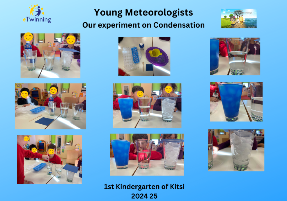 Οι μαθητές παρατήρησαν πώς σχηματίζεται υγρασία στο εξωτερικό ενός ποτηριού με παγωμένο νερό. Με τη χρήση χρώματος απέδειξαν ότι η υγρασία προέρχεται από τον αέρα, κατανοώντας έτσι τη διαδικασία της συμπύκνωσης στον κύκλο του νερού.