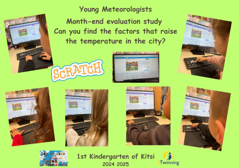 Οι μαθητές, στο πλαίσιο της αξιολόγησης του μήνα, έπαιξαν ένα εκπαιδευτικό παιχνίδι στο Scratch με τίτλο «Μπορείς να βρεις τους παράγοντες που αυξάνουν τη θερμοκρασία στην πόλη;». Μέσα από το παιχνίδι, αναγνώρισαν πηγές θερμότητας και συζήτησαν πώς επηρεάζουν το κλίμα στις αστικές περιοχές.