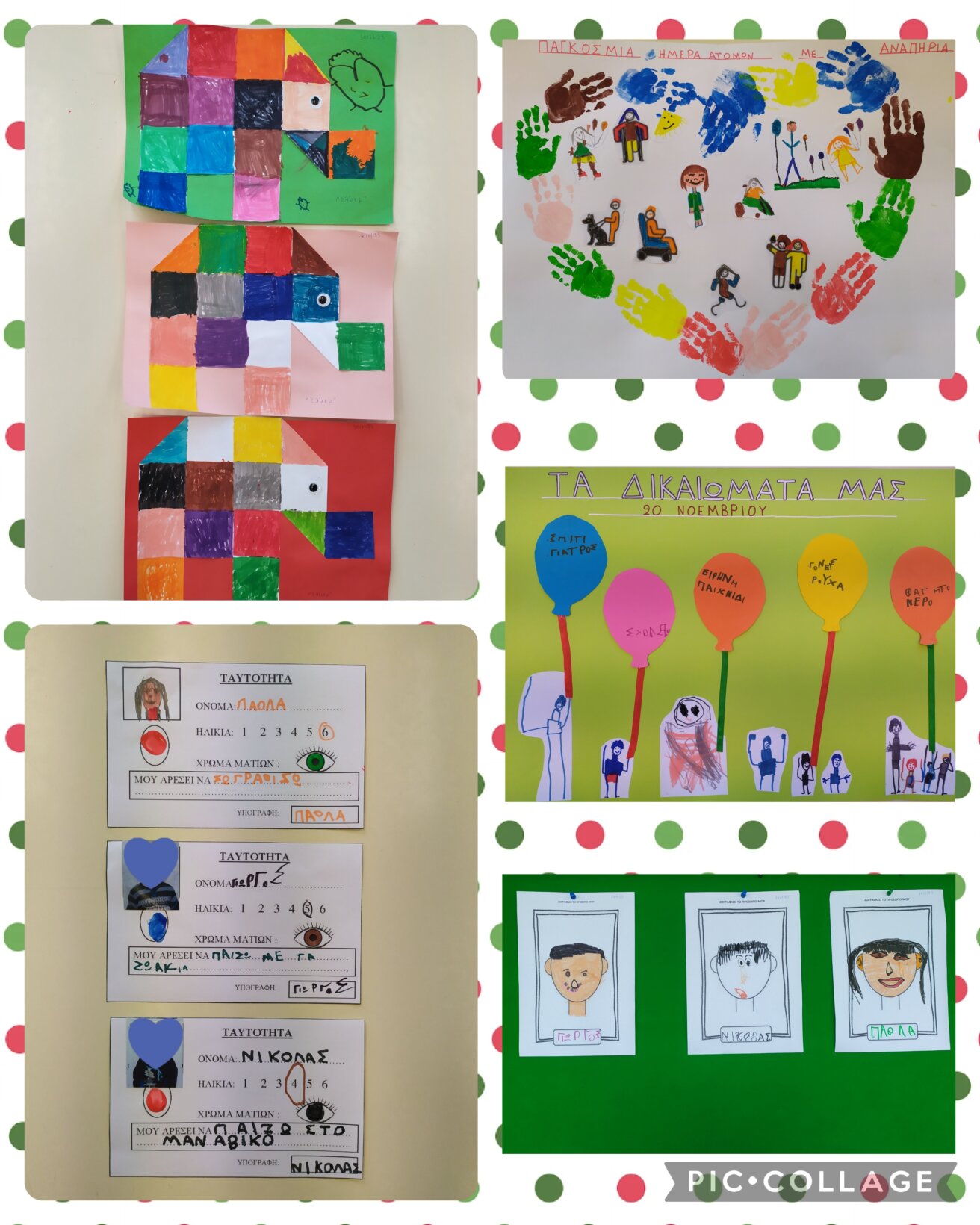 Στο Νηπιαγωγείο μας ολοκληρώσαμε το 1ο Εργαστήριο Δεξιοτήτων από τον θεματικό κύκλο «Ενδιαφέρομαι και Ενεργώ – Κοινωνική Συναίσθηση και Ευθύνη» με τίτλο «Αν όλα τα παιδιά της Γης…». Στα πλαίσια του Εργαστηρίου Δεξιοτήτων, παρατηρήσαμε τον εαυτό μας στον καθρέφτη και τον ζωγραφίσαμε, συζητήσαμε για τις ομοιότητες και τις διαφορές μας και φτιάξαμε τις ταυτότητές μας. Επίσης, προσεγγίσαμε το ζήτημα της διαφορετικότητας μέσα από την ανάγνωση βιβλίων όπως «Έλμερ, ο παρδαλός ελέφαντας» και «Το κάτι άλλο», την παρακολούθηση της ταινίας μικρού μήκους «Το δώρο» και την καταγραφή των χαρακτηριστικών που μας αρέσουν περισσότερο σε κάθε συμμαθητή μας. Ακόμη, συζητήσαμε για τα δικαιώματα των παιδιών, τα οποία είναι κοινά για όλα τα παιδιά, και για το τι χρειάζονται τα παιδιά για να είναι ευτυχισμένα. Τέλος, ακούσαμε το τραγούδι «Αν όλα τα παιδιά της Γης» και το συζητήσαμε, χρωματίσαμε τον δικό μας ελέφαντα Έλμερ ο καθένας και φτιάξαμε ομαδικές αφίσες για τα δικαιώματα των παιδιών και την Παγκόσμια Ημέρα Ατόμων με Αναπηρία.