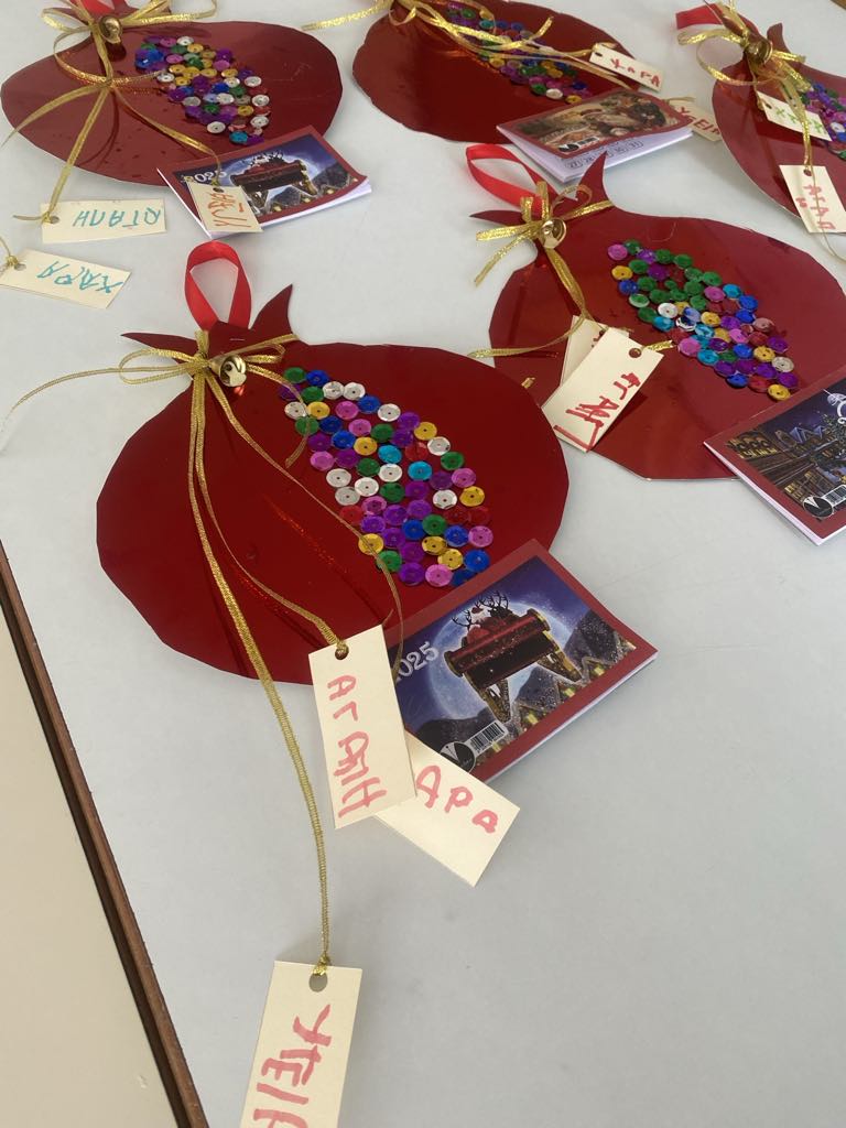 Στη συνέχεια, αφού αναφερθήκαμε στο έθιμο του “Ροδιού” το αναβιώσαμε κιόλας, σπάζοντας ένα ρόδι στην αυλή του σχολείου μας για να έχουμε τύχη και η νέα χρονιά να μας φέρει πολλά καλά! Κατασκευάσαμε στη συνέχεια ένα ημερολόγιο σε σχήμα ροδιού και γράψαμε τις ευχές μας για το 2025!