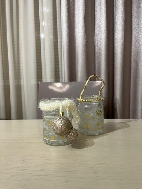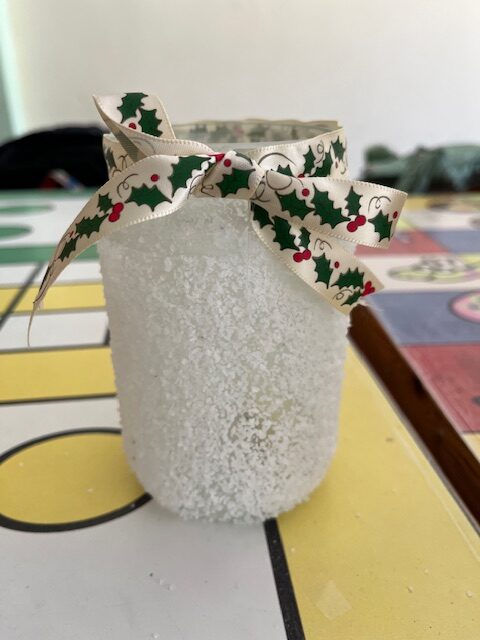 Επίσης άχρηστα γυάλινα βαζάκια μεταμορφώθηκαν σε βάσεις για κεριά, αφου πρώτα τα κοσμίσαμε με κόλλα και χοντρό αλάτι για να μοιάζουν χιονισμένα…