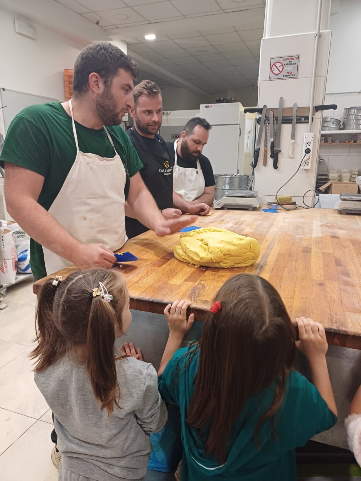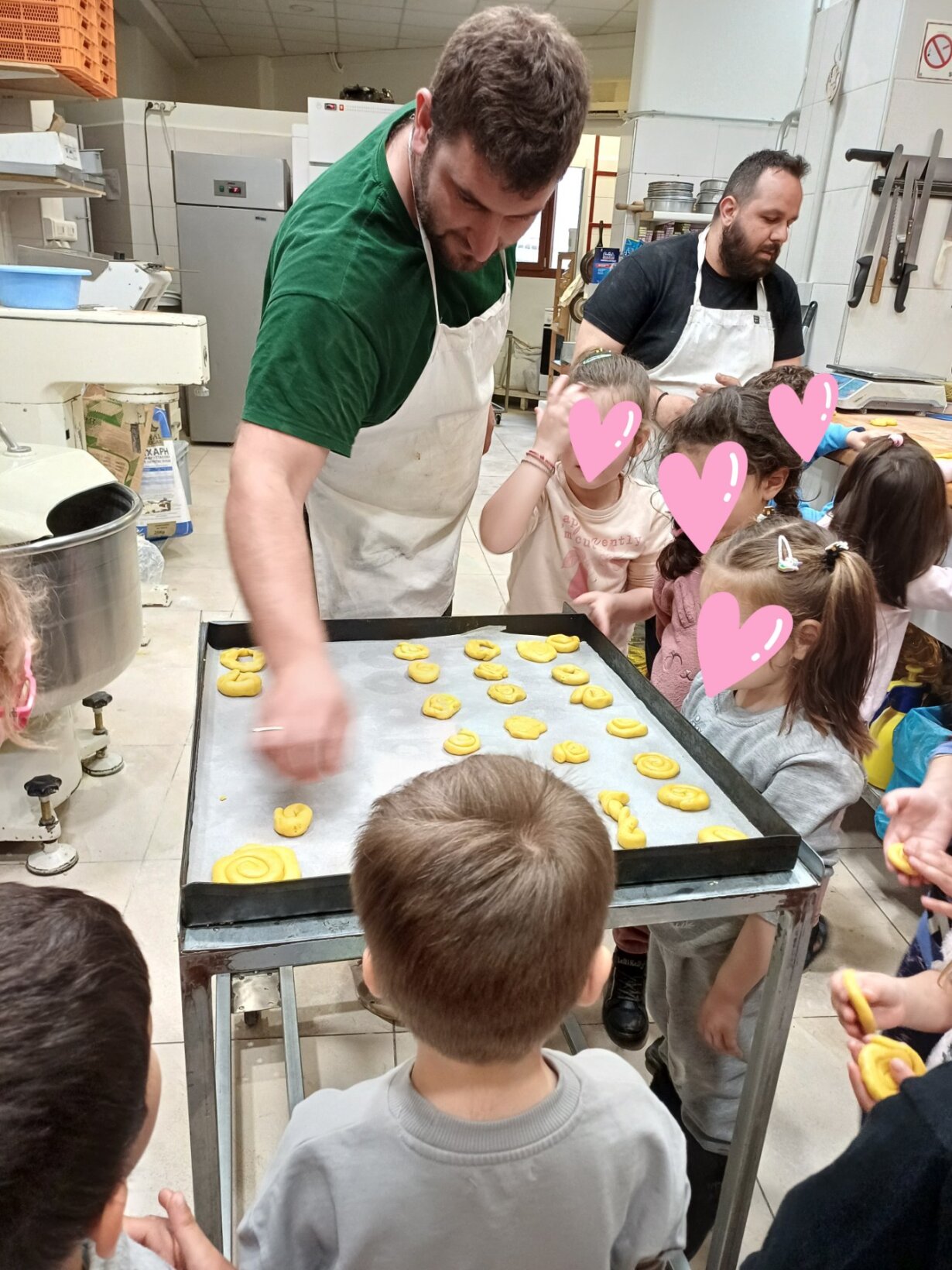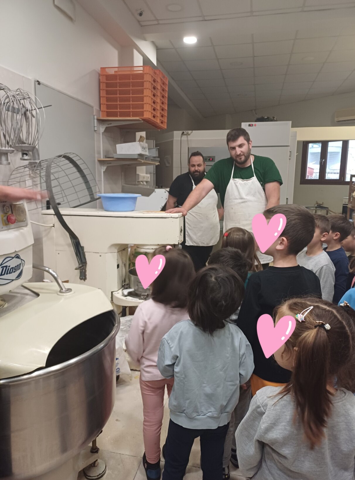 Οι ημέρες προχωρούν και ξεκινούν οι δράσεις μας και εκτός σχολείου! Προκειμένου λοιπόν να γνωρίσουμε την διαδικασία παραγωγής πασχαλινών εδεσμάτων επισκεφθήκαμε αρτοποιείο της περιοχής μας! Σε ένα ευχάριστο κλίμα οι μαθητές μας ζύμωσαν κουλουράκια και ξεναγήθηκαν στο εργαστήριο! Με την ολοκλήρωση της επίσκεψης τα παιδιά προσέφεραν την κάρτα που είχαμε ετοιμάσει για να ευχαριστήσουμε την κυρία Σία που μας υποδέχτηκε με ιδιαίτερη χαρά! Ένα κέρασμα περίμενε τα παιδιά με την ολοκλήρωση της επίσκεψης και μια αναμνηστική φωτογραφία που θα μας θύμιζε την υπέροχη πασχαλινή μας δράση!