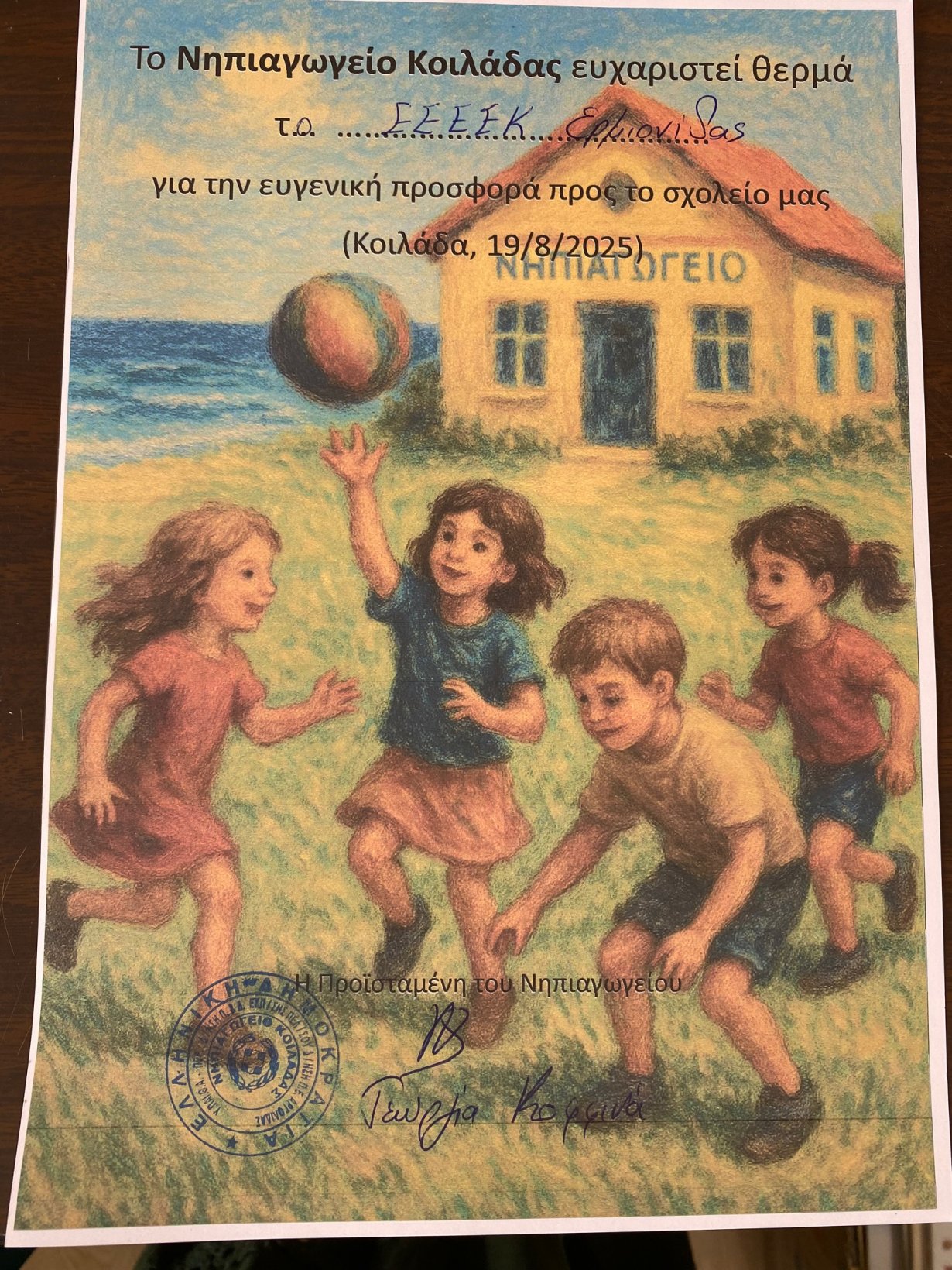 Ευχαριστούμε θερμά το ΕΕΕΕΚ Ερμιονίδας για την προσφορά υλικών στο Νηπιαγωγείο μας τα οποία εξασφαλίστηκαν με τη συμμετοχή τους στο πρόγραμμα της “Ανταποδοτικής Ανακύκλωσης”. Ευχαριστούμε την κ. Μαρία Θυμαρά και τη μαθήτρια του ΕΕΕΕΚ Ερμιονίδας Ευαγγελία Τσιρτσίκου μαζί με τη μαμά της Αρχοντία Ελένη που έφεραν τα υλικά.