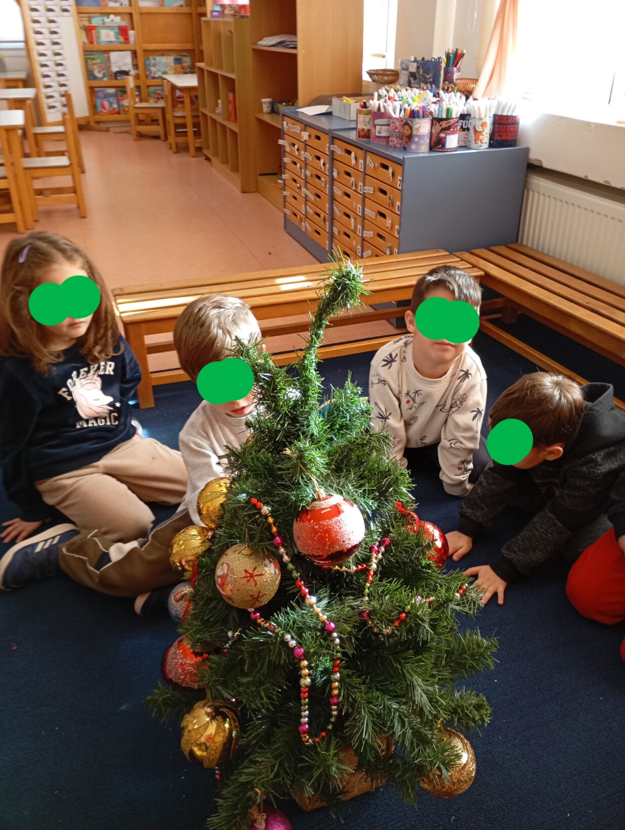 τον αναπαραστήσαμε, τραγουδήσαμε το ” Ω! Έλατο” και στη συνέχεια κάθε παιδί κρεμούσε ένα στολίδι στο δέντρο λέγοντας μια ευχή.