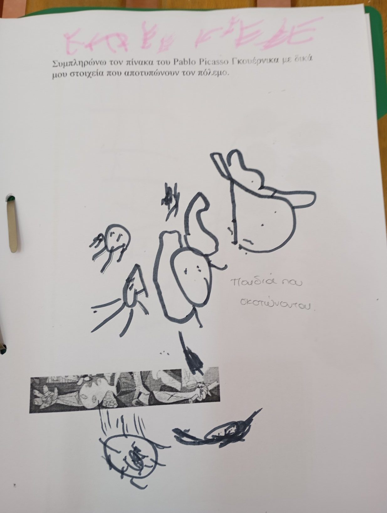 Επεξεργαστήκαμε τον πίνακα ζωγραφικής “ΓΚΟΥΕΡΝΙΚΑ”‘ του Pablo Picasso, Απομονώσαμε τα στοιχεία του πίνακα και σκεφτήκαμε τι μπορεί να συμβολίζουν και τι θα έλεγαν αν είχαν φωνή. Αποτυπώσαμε σε φύλλο εργασίας στοιχεία του πολέμου.