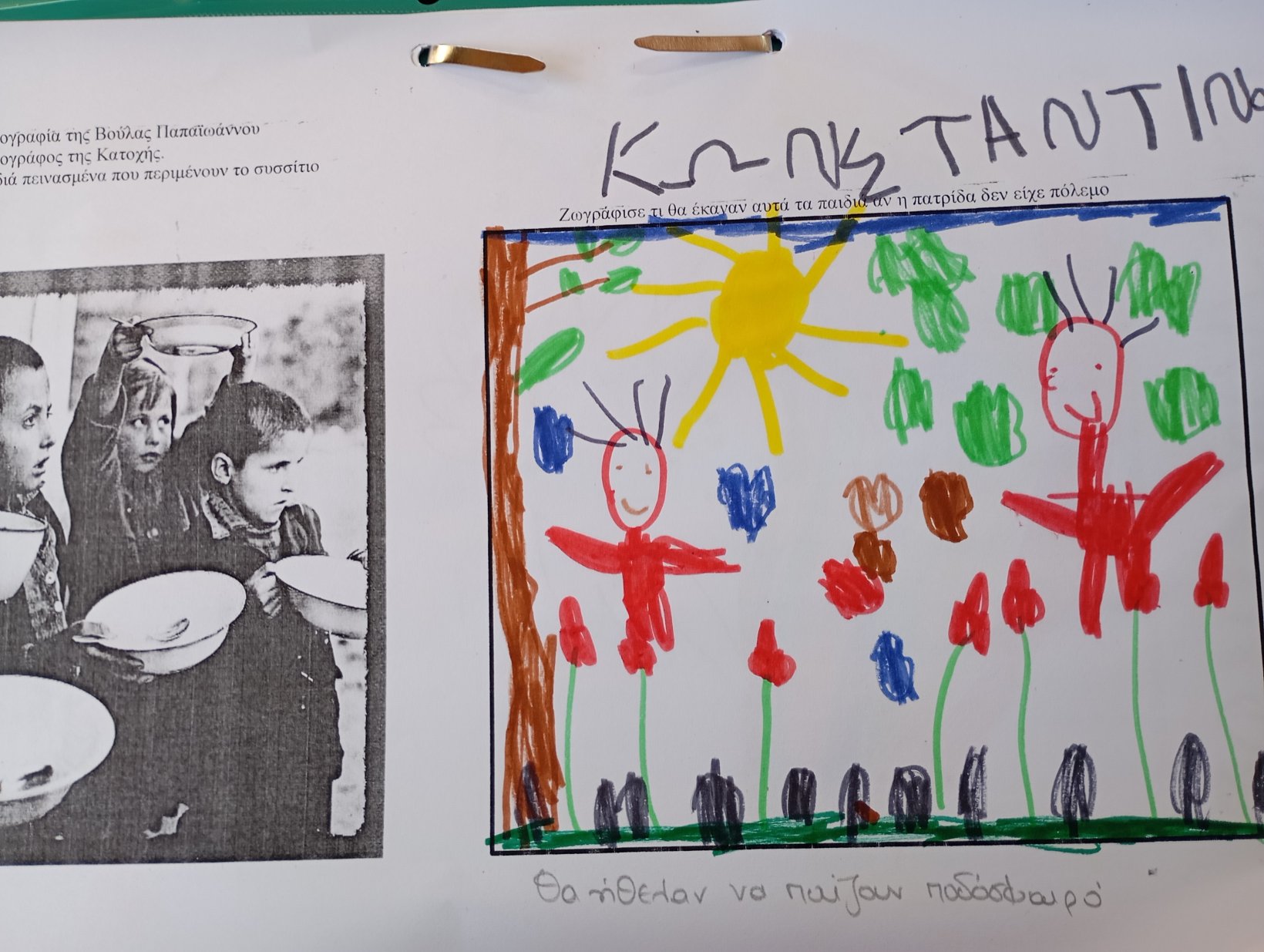 συζητήσαμε για τα δύσκολα χρόνια της κατοχής μέσα από τις εικόνες της φωτογράφου Βούλας Παπαϊωάννου. Παρατηρώντας την παρακάτω εικόνα συζητήσαμε για τα συσσίτια, αναρωτηθήκαμε και ζωγραφίσαμε τι θα ήθελαν να κάνουν τα παιδιά αν η πατρίδα μας δεν είχε πόλεμο.