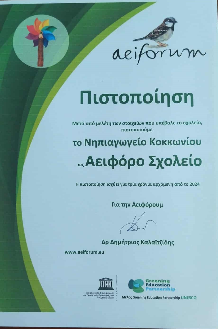 Το σχολείο  μας ήδη είχε ξκινήσει την προσπάθεια προσανατολισμού του προς την αειφορία  από την περσινή σχολική χρονιά, η οποία μας έφερε και την αντίστοιχη ετήσια πιστοποίηση 2023-24. Μετά   την αξιολόγηση των δράσεων μας κατά το σχολικό έτος 2024-25 που υποβάλαμε  στη Συντονιστική Επιτροπή και στην Παιδαγωγική Ομάδα του Αειφόρου Σχολείου  μας απονεμήθηκε η Πιστοποίηση Αειφόρου Σχολείου –Νηπιαγωγείου για τα επόμενα τρία χρόνια.