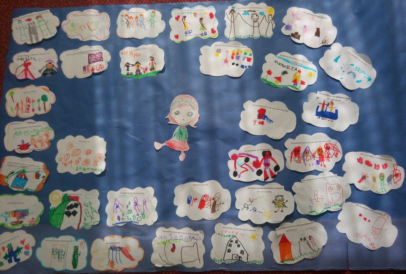 Στο πλαίσιο του εργαστηρίου δεξιοτήτων “Όλοι έχουμε δικαιώματα”, τα παιδιά συμμετείχαν ενεργά στην διερεύνηση του θέματος μέσα από ποικίλες διαθεματικές δραστηριότητες. Ένα από τα βιβλία με το οποίο προσεγγίσαμε το θέμα ήταν  «Η κούκλα που ταξίδευε στον κόσμο, Α. Μητσιάλα, εκδ. Παπαδόπουλος, 2012). Με αφορμή το βιβλίο, τα παιδιά δημιούργησαν μία αφίσα, αποτυπώνοντας εικαστικά τα δικαιώματα τους, ¨ώστε η κούκλα να ταξιδέψει και να μεταφέρει το μήνυμα τους σε όλο τον κόσμο !!!