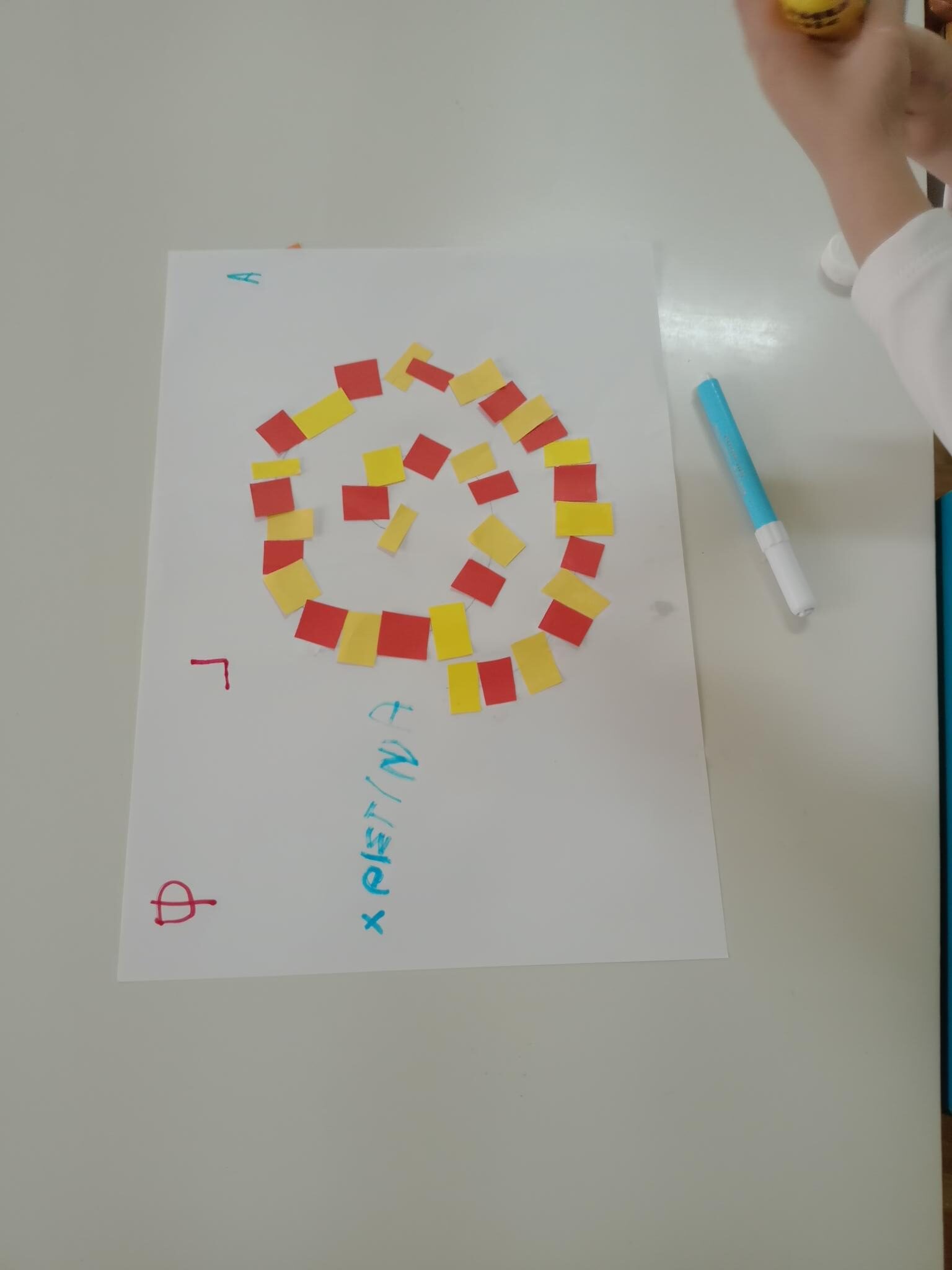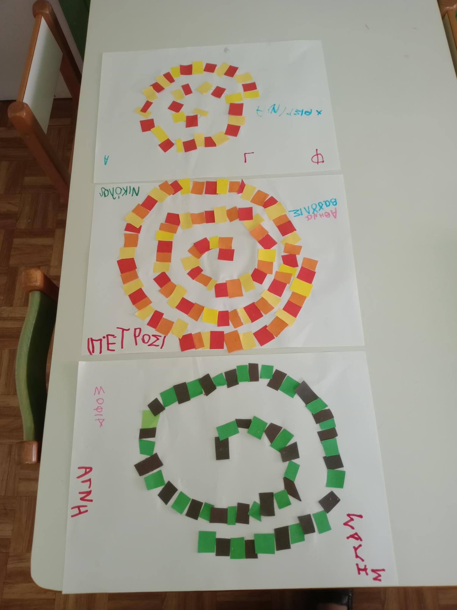 συνεργαστήκαμε σε ομάδες ώστε να φτιάξουμε το σχήμα της σπείρας με συγκεκριμένο μοτίβο. Κάθε ομάδα διάλεξε και άλλο μοτίβο.