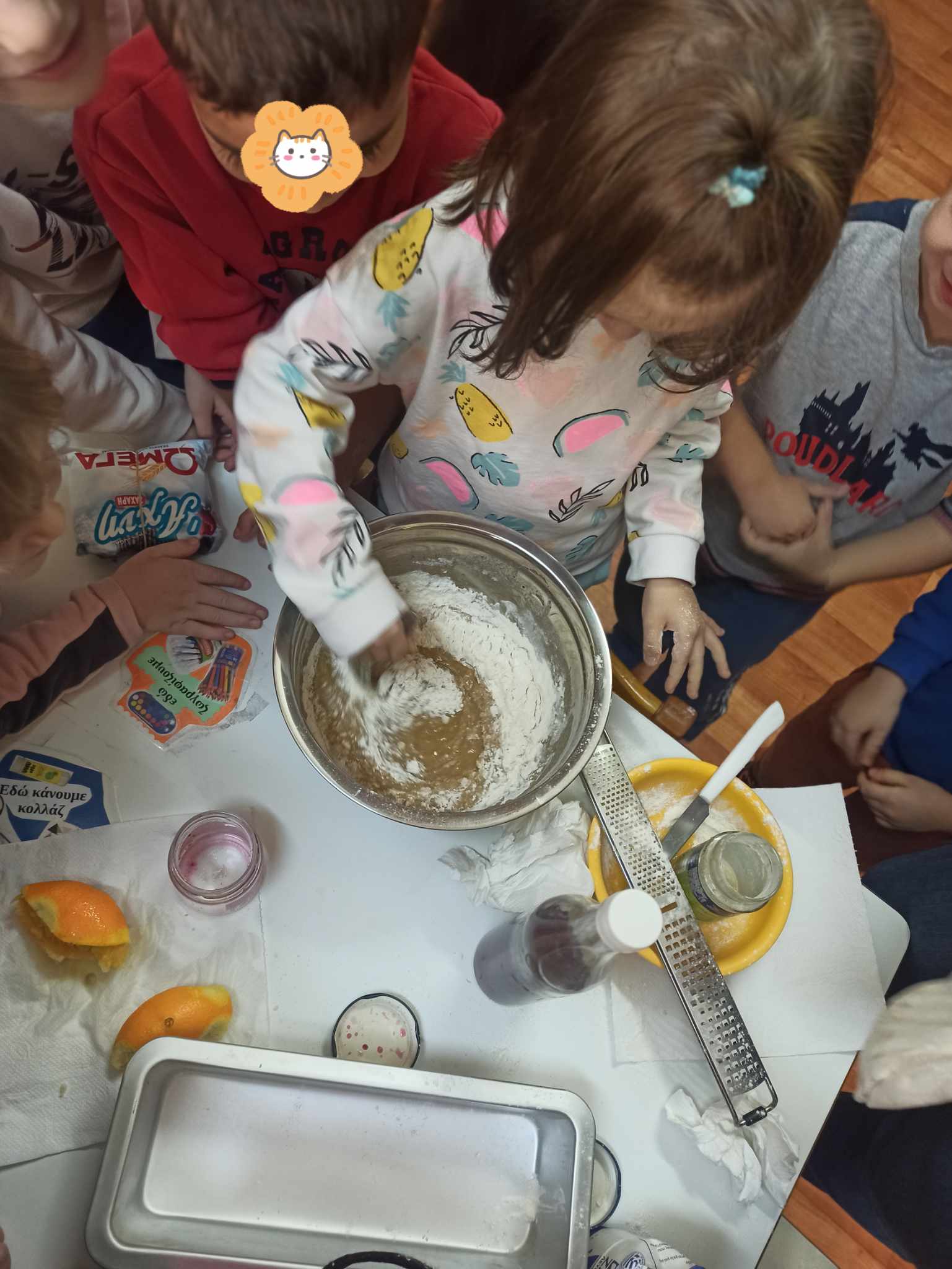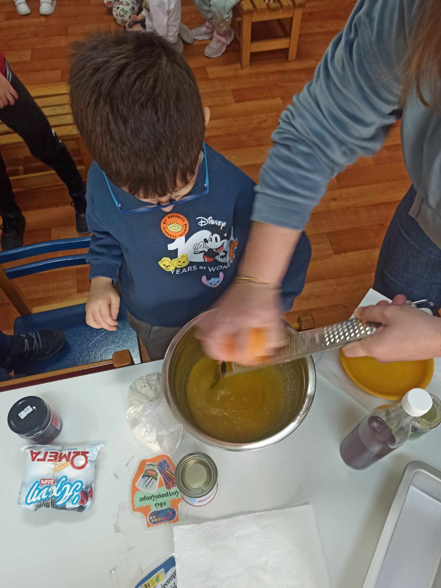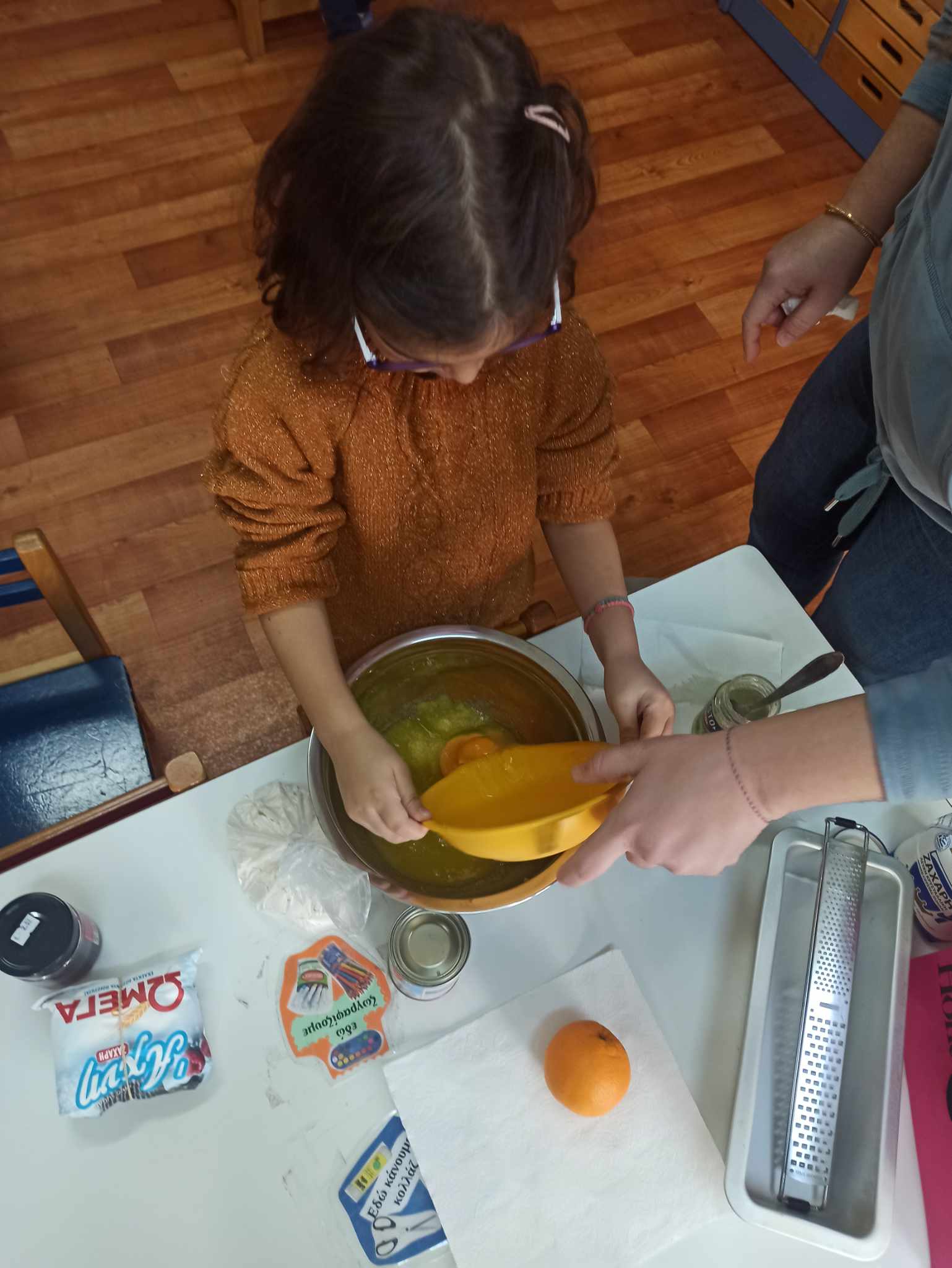Τέλος, σε συνεργασία με τους μαθητές, μαγειρέψαμε ένα φθινοπωρινό κέικ με πορτοκάλι και χυμό ρόδι. Το σχολείο μοσχοβόλησε και κεράσαμε τους συμμαθητές μας.