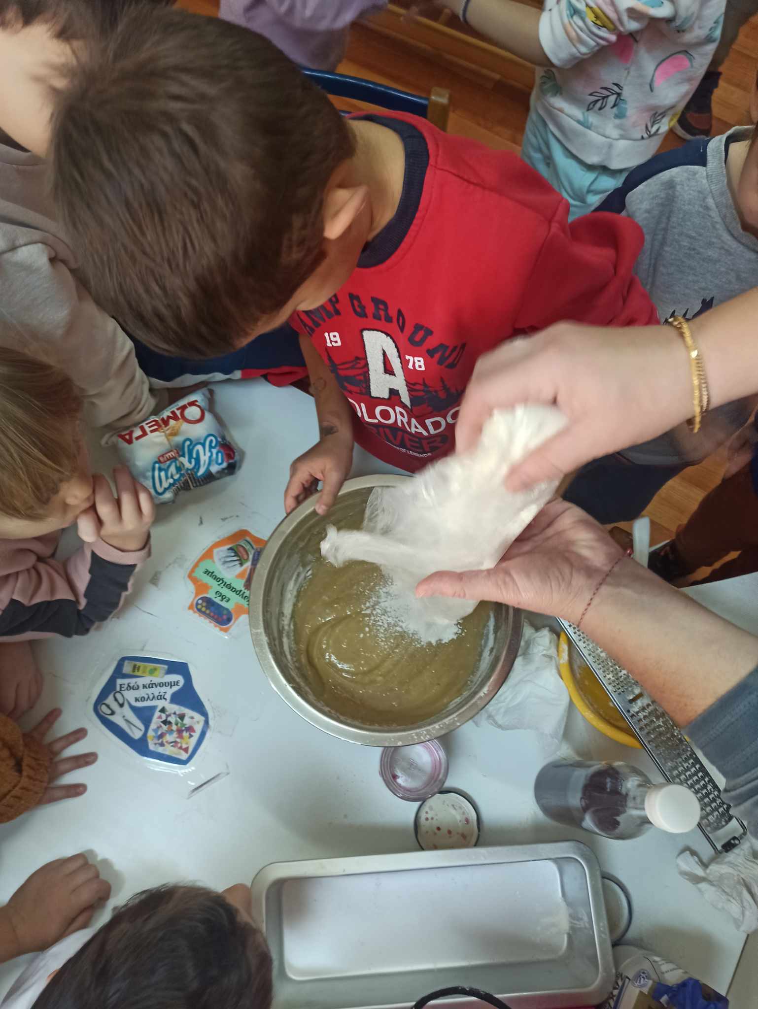 Γράψαμε τα υλικά, τα ζυγίσαμε και βάλαμε τις σωστές ποσότητες.