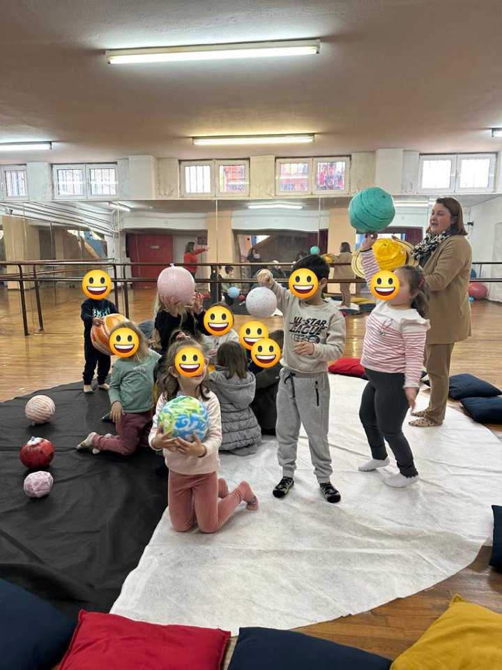 Τέλος, αφού καθίσαμε σε κύκλο, παίξαμε το παιχνίδι της μέρας και της νύχτας, παίξαμε με τους πλανήτες σε τρισδιάστατο σχήμα και μεγάλο μέγεθος και παρατηρήσαμε την κίνηση των πλανητών γύρω από τον ήλιο μέσα από τον προσομοιωτή που διέθετε το 9ο Δημοτικό σχολείο.