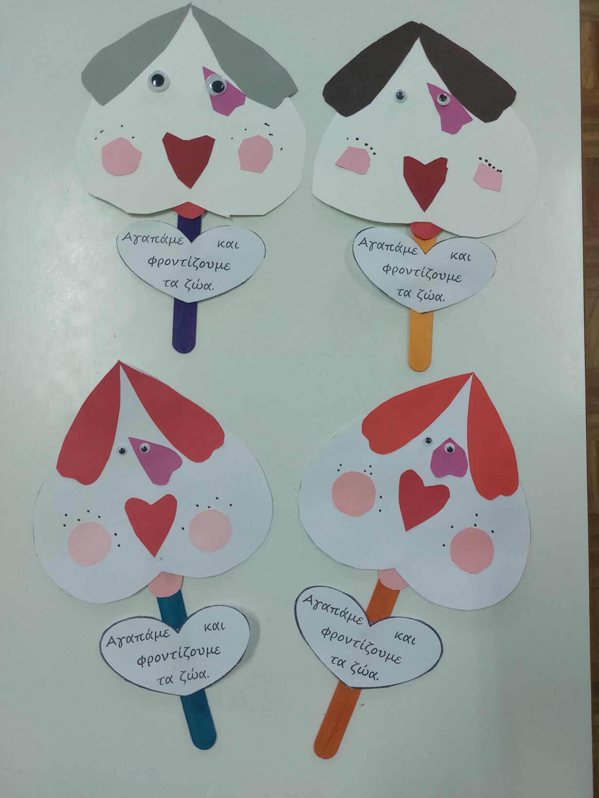 Η κατασκευή μας είναι ένα σκυλάκι από καρδούλες για να δείξουμε την φροντίδα, την βοήθεια και την αγάπη μας προς τα ζώα. Επίσης, δημιουργήσαμε μαζί με τα παιδιά και από τα τρία τμήματα του σχολείου μια αφίσα με διάφορα ζωάκια φτιαγμένα από τα χεράκια τους.