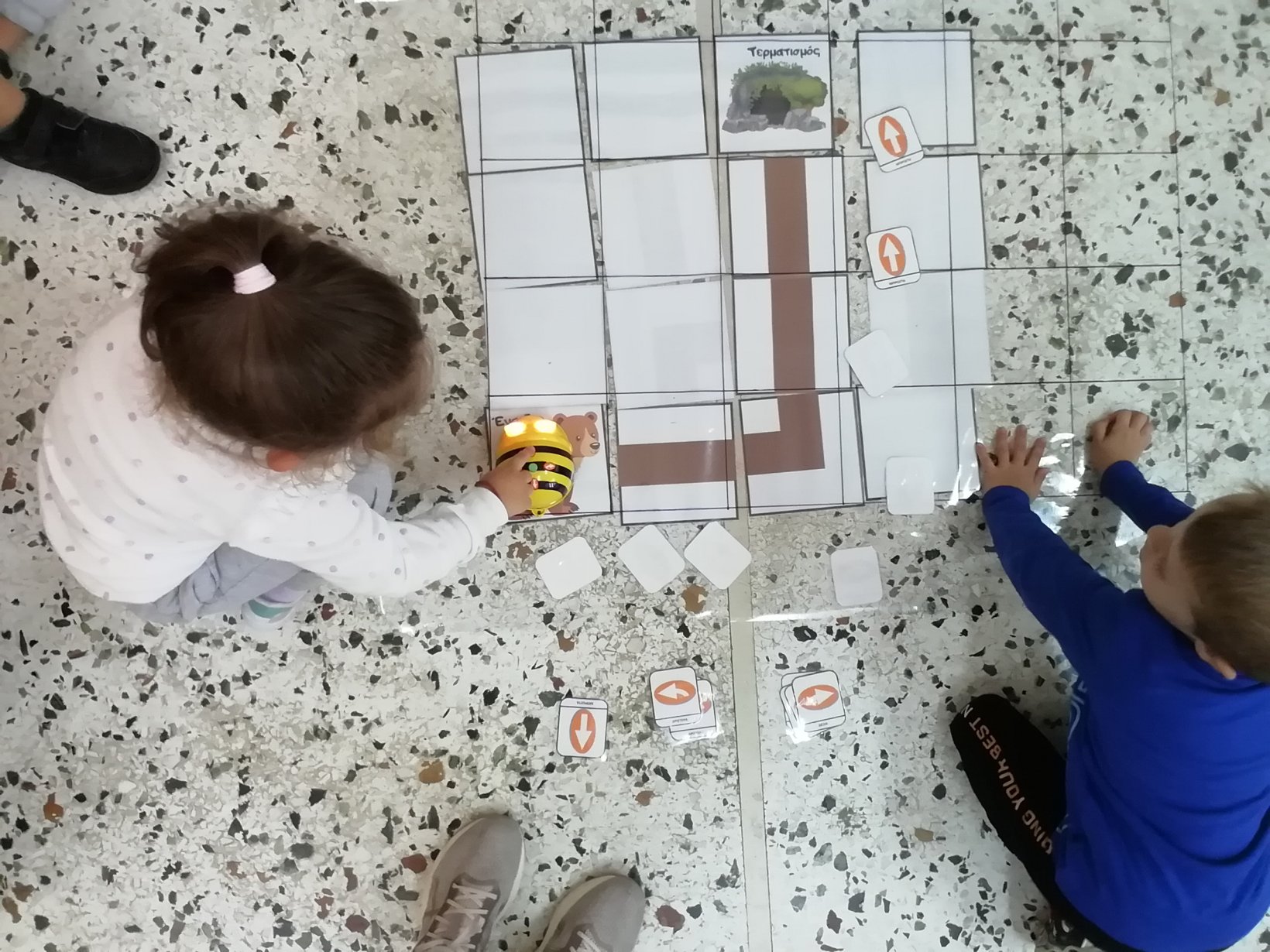 4. Προγραμματισμός Bee-Bot: Τα παιδιά εισάγουν τις εντολές στο Bee-Bot πατώντας τα κατάλληλα κουμπιά. (Εμπράγματα)