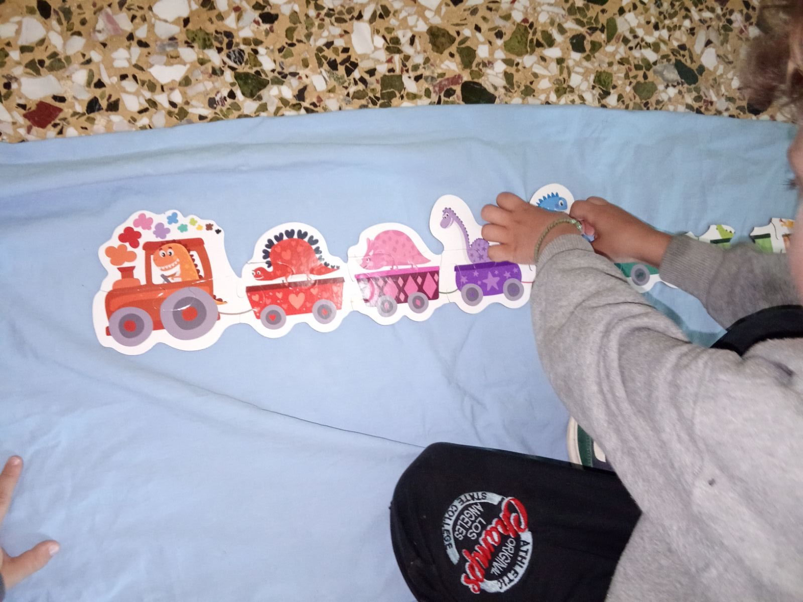 Για να ενισχύσουμε την συνεργασία και την ομαδικότητα στα παιδιά, παίξαμε με ένα βιβλίο-παζλ, “Το Τρενάκι των Δεινοσαύρων”.