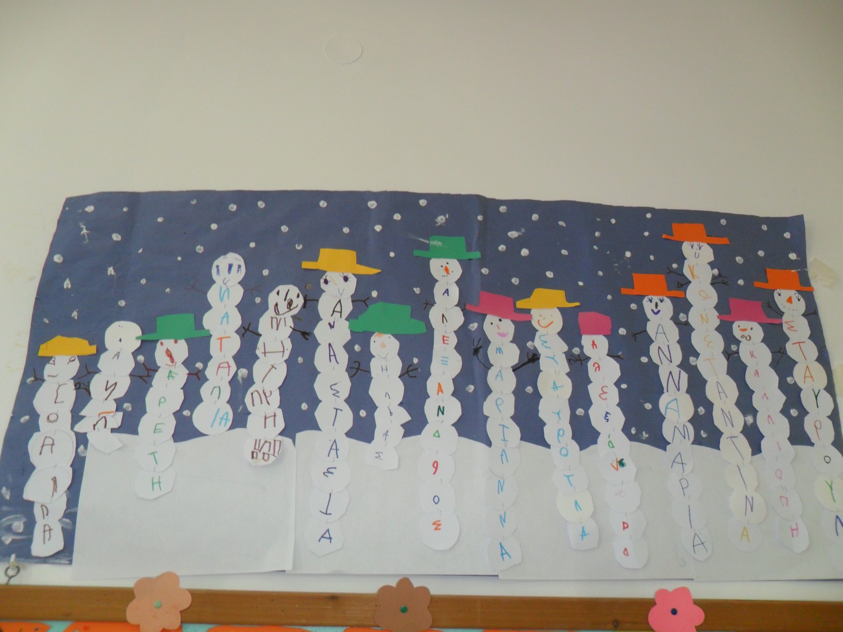 Κατασκευή χειμωνιάτικου τοπίου με χιονάνθρωπους με τα γράμματα του ονόματος των παιδιών στα κυκλάκια του χιονάνθρωπων