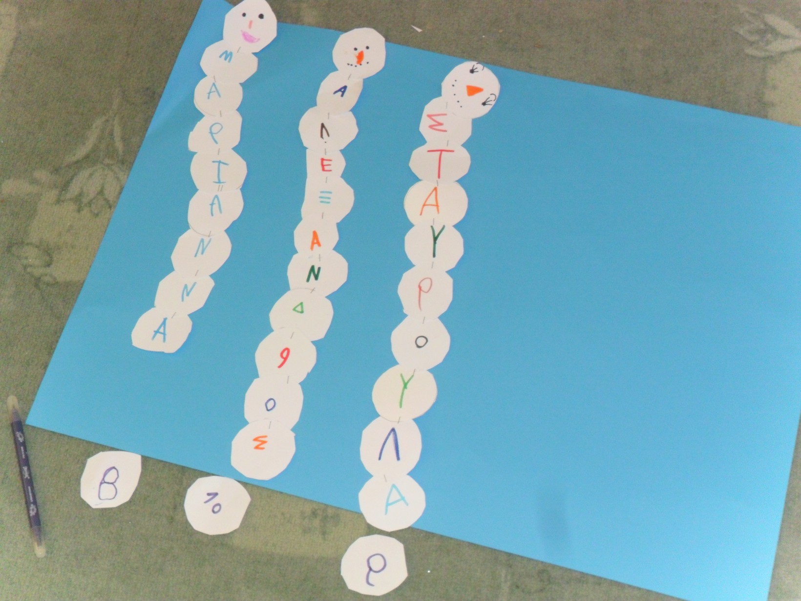 Γραφή γραμμάτων των ονομάτων των παιδιών σε κυκλάκια για τη δημιουργία χιονάνθρωπου με στόχο το μέτρημα των γραμμάτων του κάθε παιδιού σε ομαδική κατασκευή