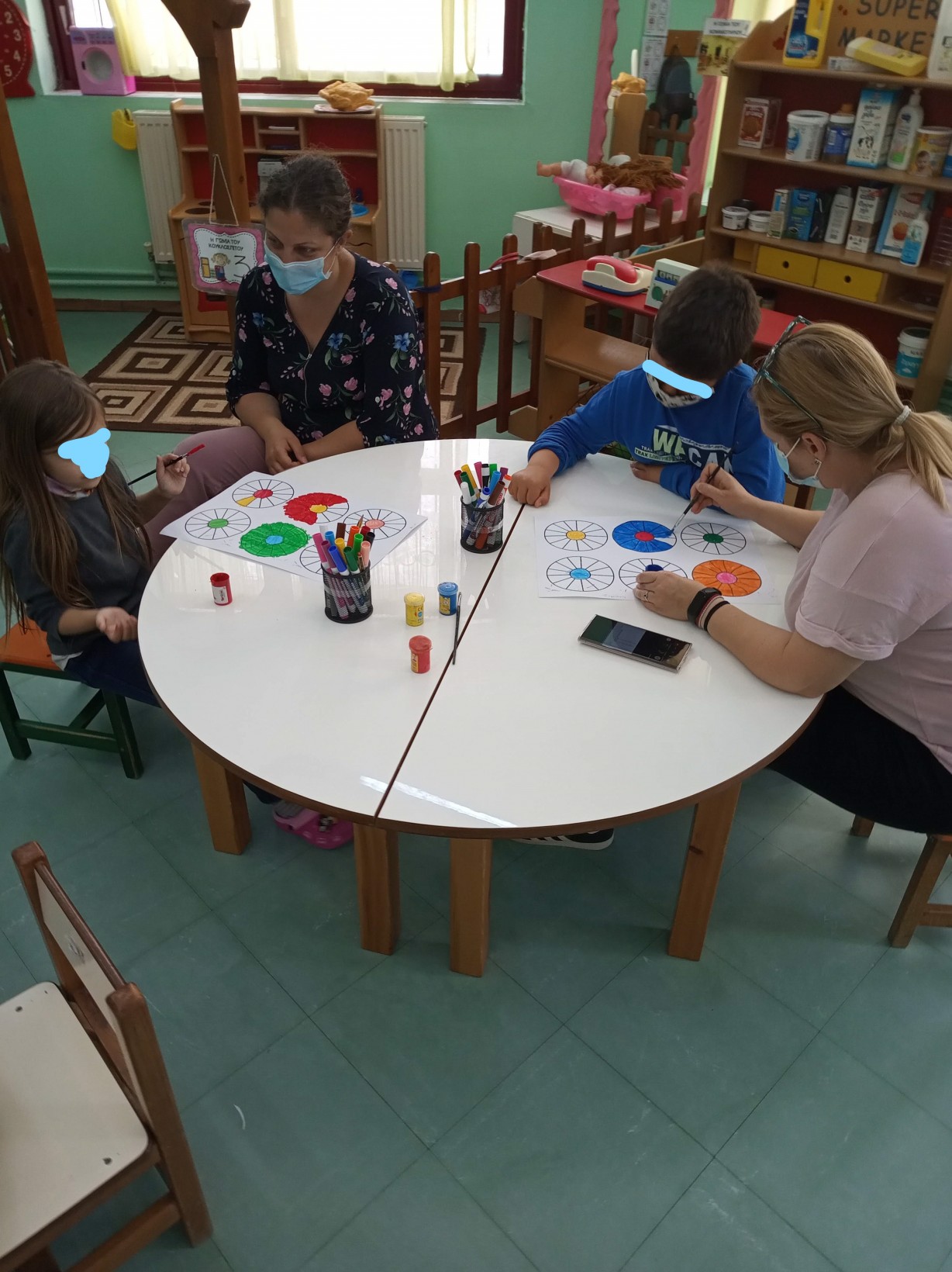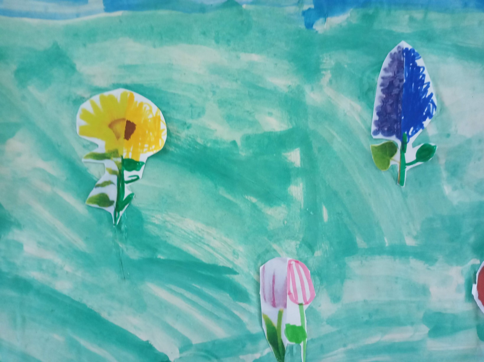 Φτιάξαμε ομαδική εργασία το λουλουδοδάσος . Κάθε παιδί πήρε τρία μισά λουλούδια και αφού ζωγράφισε το άλλο μισό το έκοψε και το κόλλησε στο χαρτόνι .